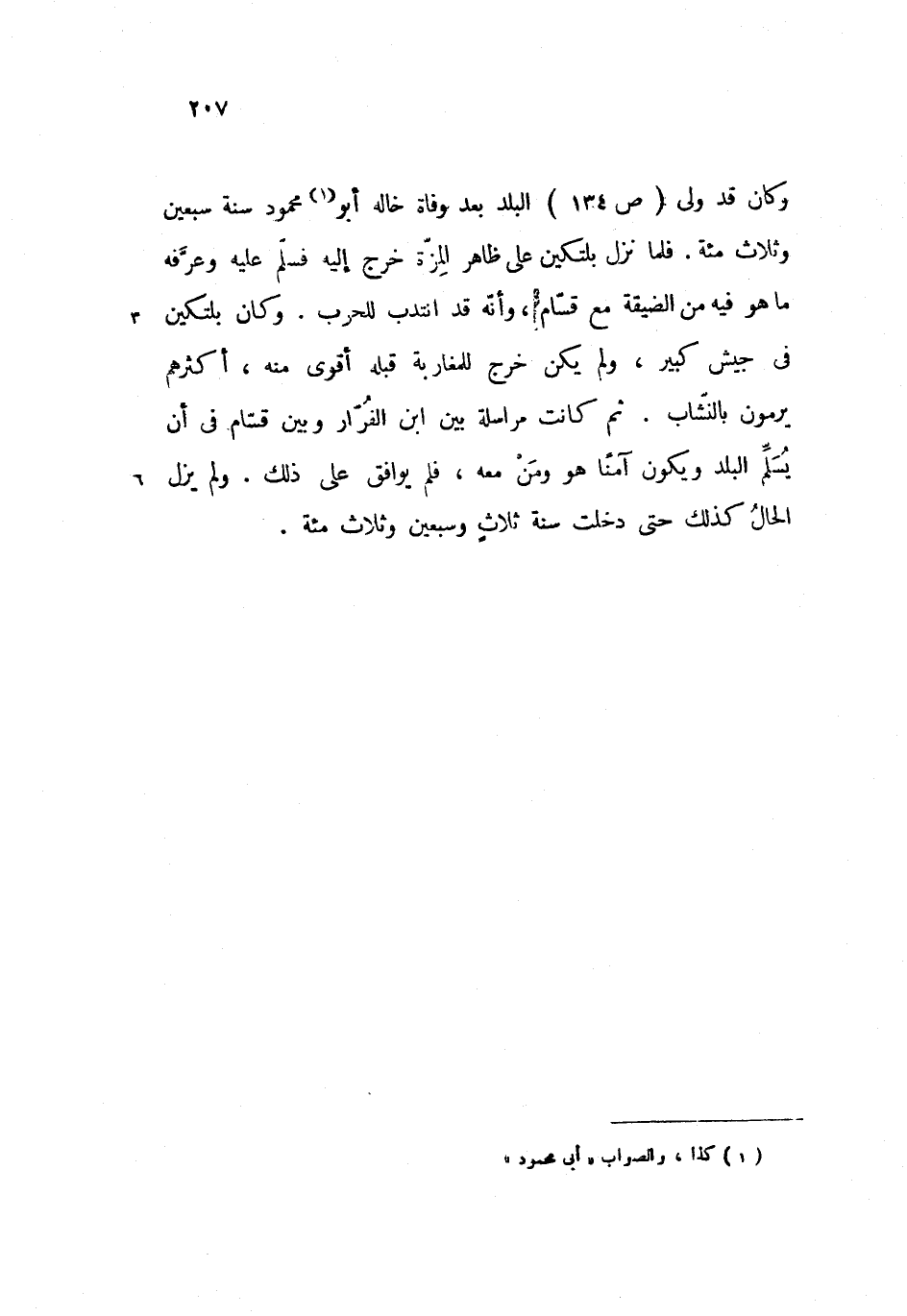وكان قد ولى (ص 134) البلد بعد وفاة خاله أبو محمود سنة سبعين وثلاث مئة. فلما نزل بلتكين على ظاهر المزّة خرج إليه فسلّم عليه وعرّفه ما هو فيه من الضيقة مع قسّام، وأنّه قد انتدب للحرب. وكان بلتكين فى جيش كبير، ولم يكن خرج للمغاربة قبله أقوى منه، أكثرهم يرمون بالنّشاب. ثم كانت مراسلة بين ابن الفرّار وبين قسّام فى أن يسلّم البلد ويكون آمنا هو ومن معه، فلم يوافق على ذلك. ولم يزل الحال كذلك حتى دخلت سنة ثلاث وسبعين وثلاث مئة.