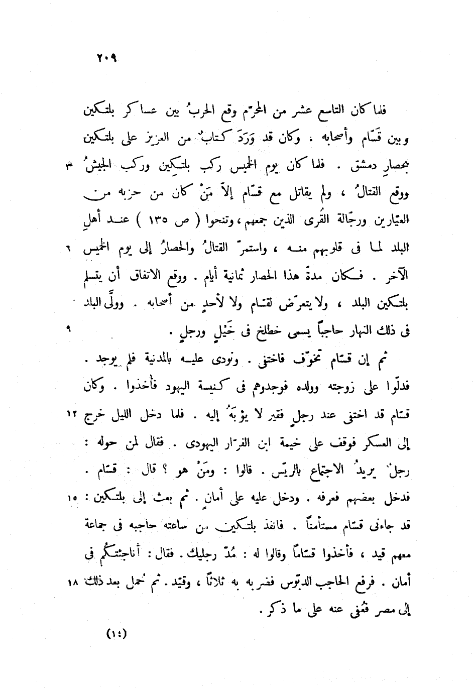 فلما كان التاسع عشر من المحرّم وقع الحرب بين عساكر بلتكين وبين قسّام وأصحابه. وكان قد ورد كتاب من العزيز على بلتكين بحصار دمشق. فلما كان يوم الخميس ركب بلتكين وركب الجيش ووقع القتال، ولم يقاتل مع قسّام إلاّ من كان من حزبه من العيّارين ورجّالة القرى الذين جمعهم، وتنحوا (ص 135) عند أهل البلد لما فى قلوبهم منه، واستمرّ القتال والحصار إلى يوم الخميس الآخر. فكان مدّة هذا الحصار ثمانية أيام. ووقع الاتفاق أن يتسلم بلتكين البلد، ولا يتعرّض لقسّام ولا لأحد من أصحابه. وولّى البلد فى ذلك النهار حاجبا يسمى خطلخ فى خيل ورجل.