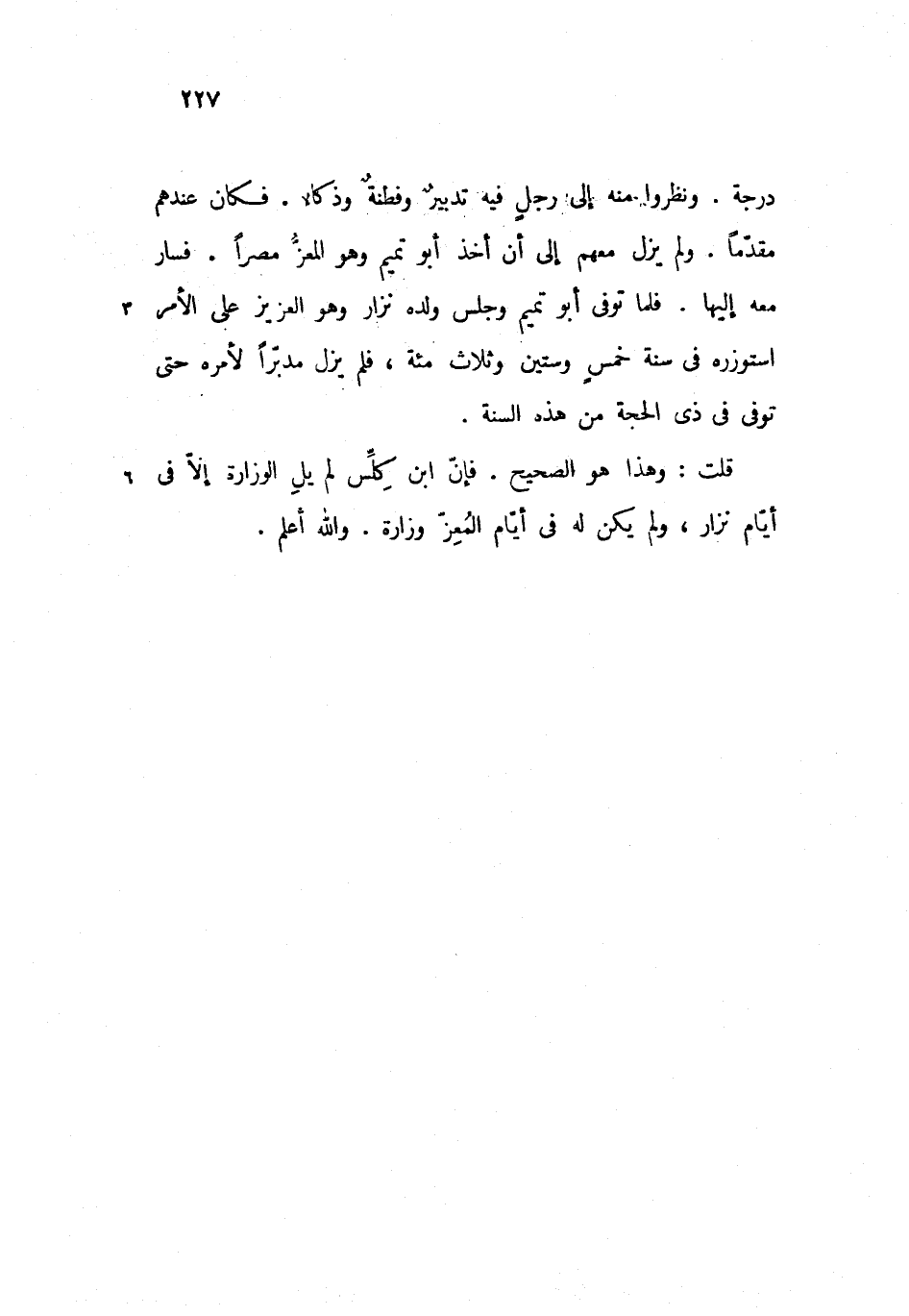 قلت: وهذا هو الصحيح. فإنّ ابن كلّس لم يل الوزارة إلاّ فى أيّام نزار، ولم يكن له فى أيّام المعزّ وزارة. والله أعلم.