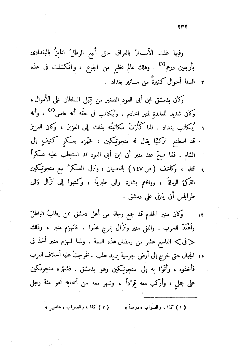 وفيها غلت الأسعار بالعراق حتى أبيع الرطل الخبز بالبغدادى بأربعين درهم. وهلك عالم عظيم من الجوع، وانكشفت فى هذه السنة أحوال كثيرة من مساتير بغداد.