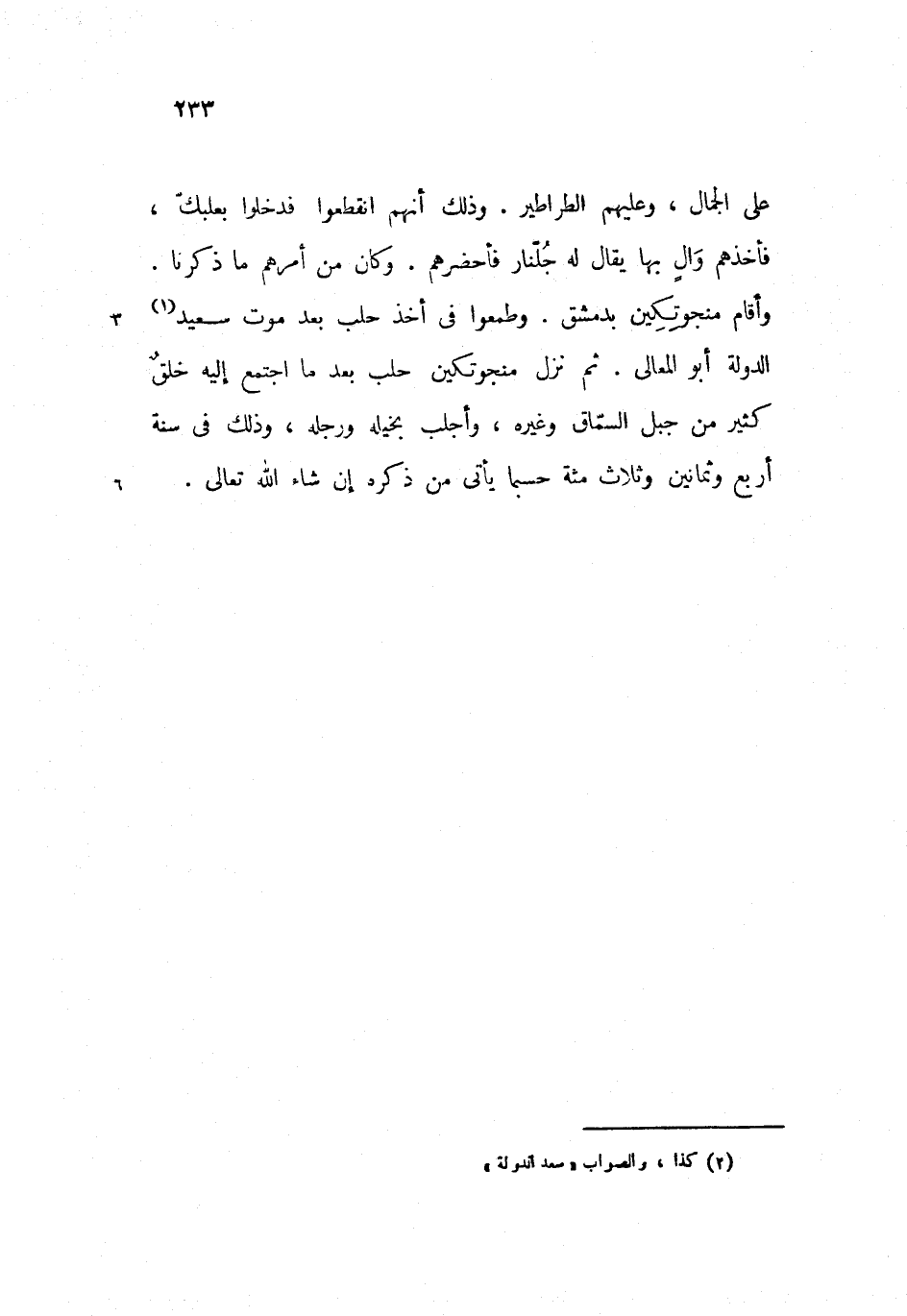 وأقام منجوتكين بدمشق. وطمعوا فى أخذ حلب بعد موت سعيد الدولة أبو المعالى. ثم نزل منجوتكين حلب بعد ما اجتمع إليه خلق كثير من جبل السمّاق وغيره، وأجلب بخيله ورجله، وذلك فى سنة أربع وثمانين وثلاث مئة حسبما يأتى من ذكره إن شاء الله تعالى.