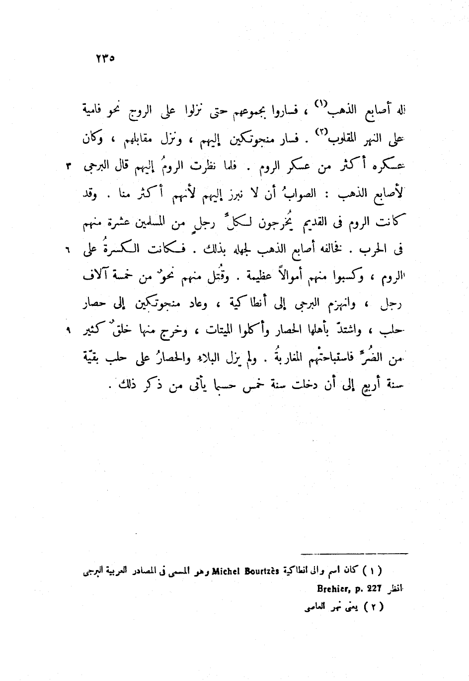 له أصابع الذهب، فساروا بجموعهم حتى نزلوا على الروج نحو فامية على النهر المقلوب. فسار منجوتكين إليهم، ونزل مقابلهم، وكان عسكره أكثر من عسكر الروم. فلما نظرت الروم إليهم قال البرجى لأصابع الذهب: الصواب أن لا نبرز إليهم لأنهم أكثر منا. وقد كانت الروم فى القديم يخرجون لكلّ رجل من المسلمين عشرة منهم فى الحرب. فخالفه أصابع الذهب لجهله بذلك. فكانت الكسرة على الروم، وكسبوا منهم أموالا عظيمة. وقتل منهم نحو من خمسة آلاف رجل، وانهزم البرجى إلى أنطاكية، وعاد منجوتكين إلى حصار حلب، واشتدّ بأهلها الحصار وأكلوا الميتات، وخرج منها خلق كثير من الضرّ فاستباحتهم المغاربة. ولم يزل البلاء والحصار على حلب بقيّة سنة أربع إلى أن دخلت سنة خمس حسبما يأتى من ذكر ذلك.