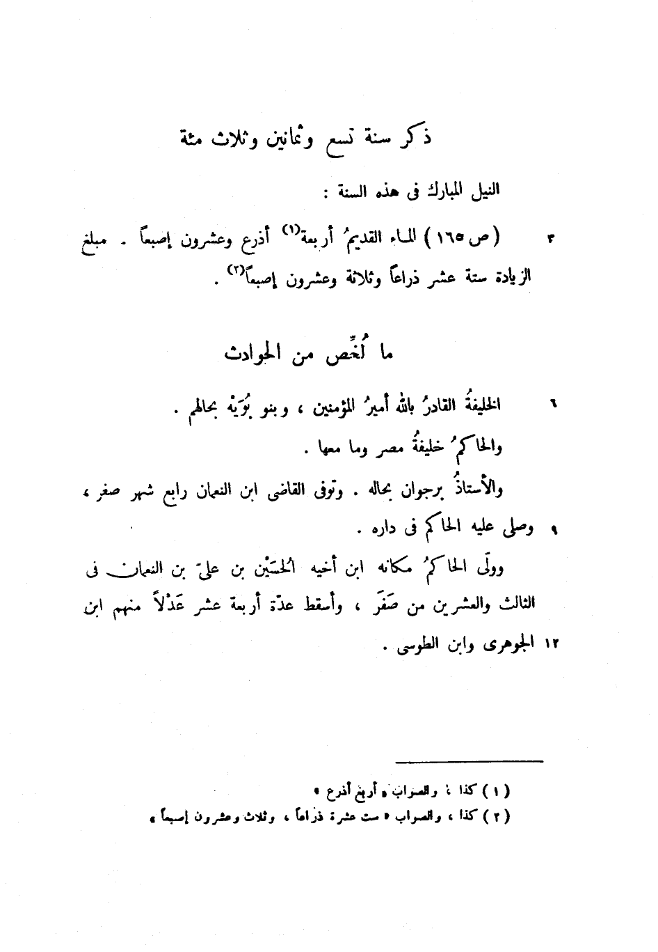 (ص 165) الماء القديم أربعة أذرع وعشرون إصبعا. مبلغ الزيادة ستة عشر ذراعا وثلاثة وعشرون إصبعا.