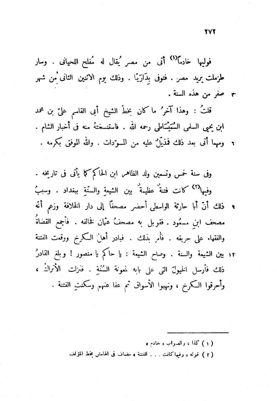 وفيها كانت فتنة عظيمة بين الشيعة والسنّة ببغداد. وسبب ذلك أنّ أبا حارثة الواسطى أحضر مصحفا إلى دار الخلافة وزعم أنّه مصحف ابن مسعود. فقوبل به مصحف عثمان فخالفه. فأجمع القضاة والفقهاء على حريقه. فأمر بذلك. فبادر أهل الكرخ ووقعت الفتنة بين الشيعة والسنة. وصاح الشيعة: يا حاكم يا منصور! وبلغ القادر ذلك فأرسل الخيول التى على بابه لمعونة السنّة. فنزلت الأتراك، وأحرقوا الكرخ، ونهبوا الأسواق ثم عفا عنهم وسكنت الفتنة.