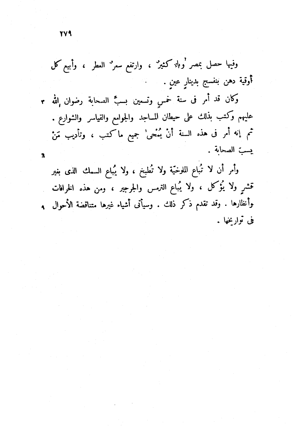 وأمر أن لا تباع الملوخيّة ولا تطبخ، ولا يباع السمك الذى بغير قشر ولا يؤكل، ولا يباع الترمس والجرجير، ومن هذه الخرافات وأنظارها. وقد تقدم ذكر ذلك. وسيأتى أشياء غيرها متناقضة الأحوال فى تواريخها.