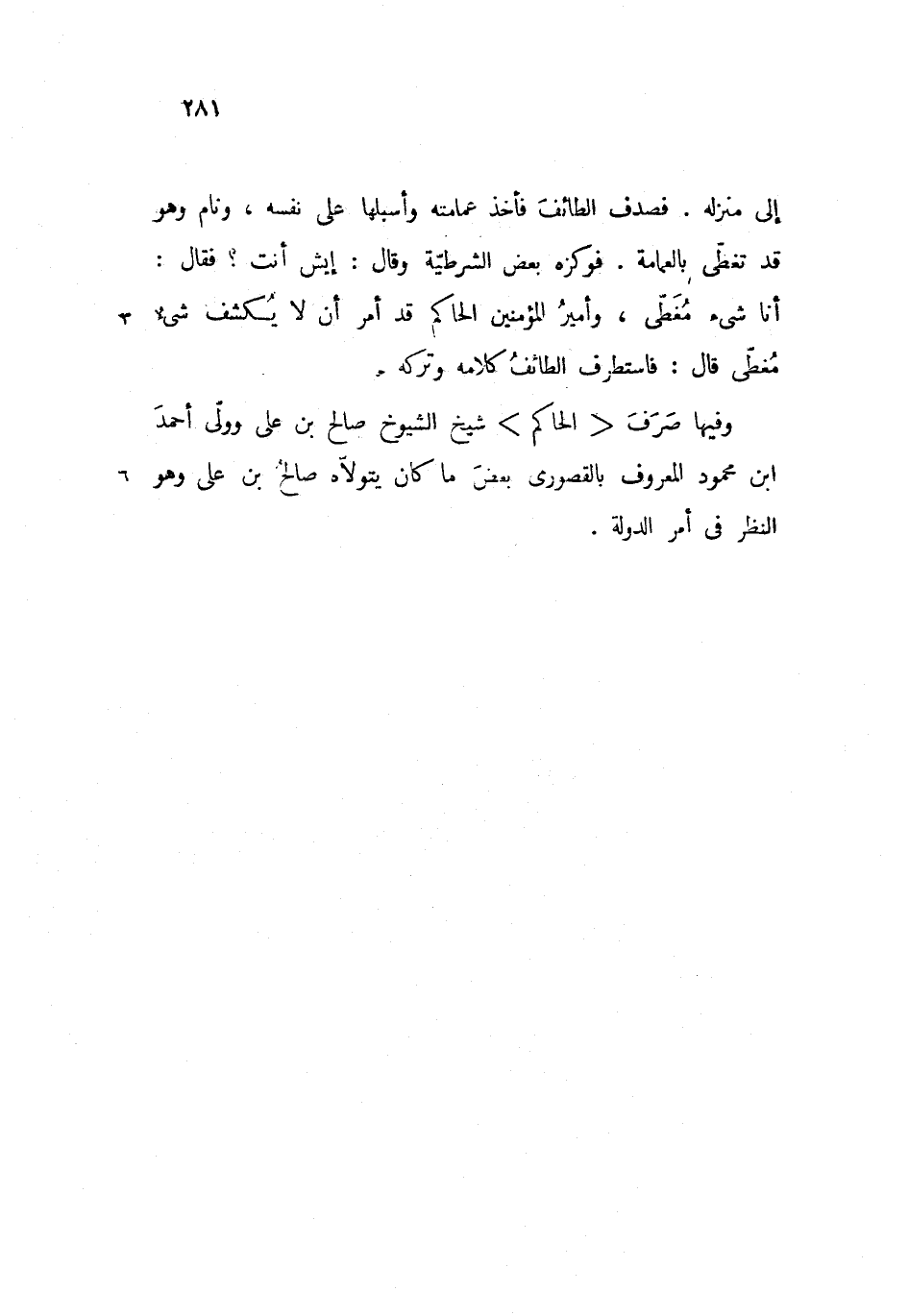 إلى منزله. فصدف الطائف فأخذ عمامته وأسبلها على نفسه، ونام وهو قد تغطّى بالعمامة. فوكزه بعض الشرطيّة وقال: إيش أنت؟ فقال: