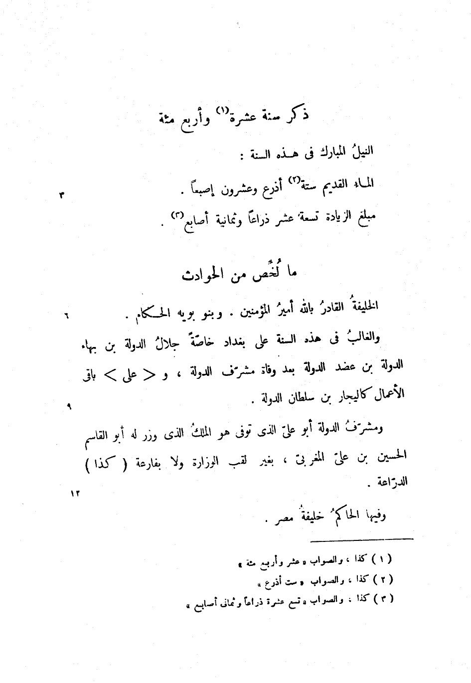 والغالب فى هذه السنة على بغداد خاصّة جلال الدولة بن بهاء الدولة بن عضد الدولة بعد وفاة مشرّف الدولة، و <على> باقى الأعمال كاليجار بن سلطان الدولة.
