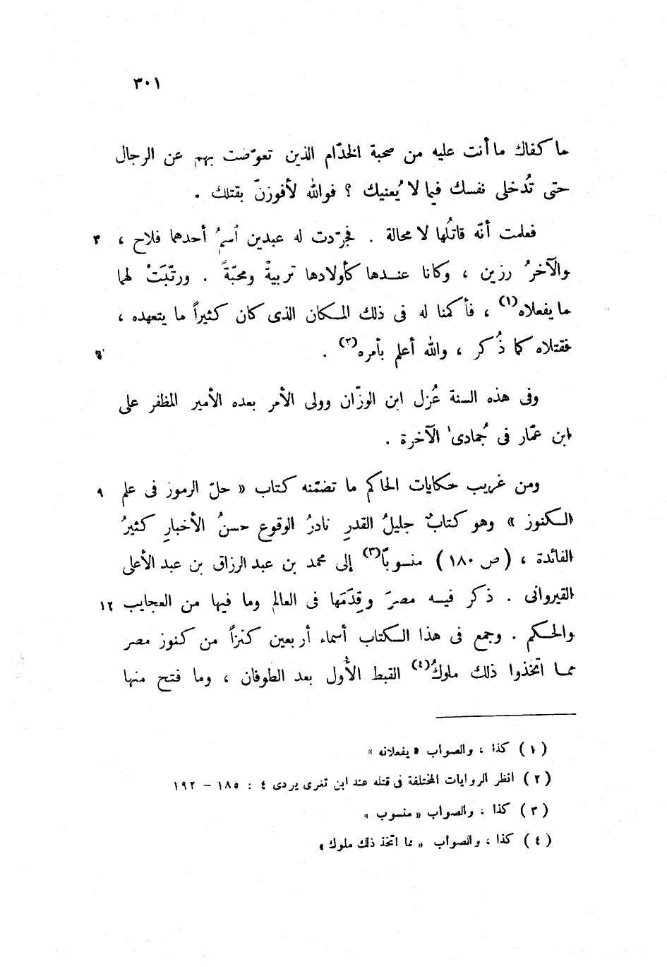 فعلمت أنّه قاتلها لا محالة. فجرّدت له عبدين اسم أحدهما فلاح، والآخر رزين، وكانا عندها كأولادها تربية ومحبّة. ورتّبت لهما ما يفعلاه، فأكمنا له فى ذلك المكان الذى كان كثيرا ما يتعهده، فقتلاه كما ذكر، والله أعلم بأمره.