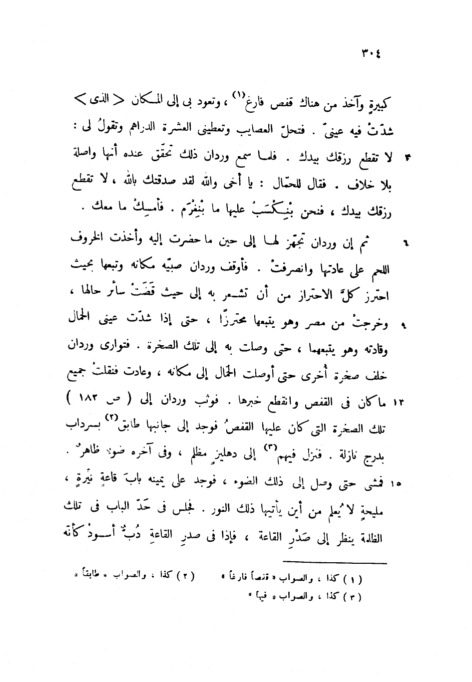 ثم إن وردان تجهّز لها إلى حين ما حضرت إليه وأخذت الخروف اللحم على عادتها وانصرفت. فأوقف وردان صبيّه مكانه وتبعها بحيث احترز كلّ الاحتراز من أن تشعر به إلى حيث قضت سائر حالها، وخرجت من مصر وهو يتبعها محترزا، حتى إذا شدّت عينى الحمال وقادته وهو يتبعهما، حتى وصلت به إلى تلك الصخرة. فتوارى وردان خلف صخرة أخرى حتى أوصلت الحمّال إلى مكانه، وعادت فنقلت جميع ما كان فى القفص وانقطع خبرها. فوثب وردان إلى (ص 182) تلك الصخرة التى كان عليها القفص فوجد إلى جانبها طابق بسرداب بدرج نازلة. فنزل فيهم إلى دهليز مظلم، وفى آخره ضوء ظاهر.