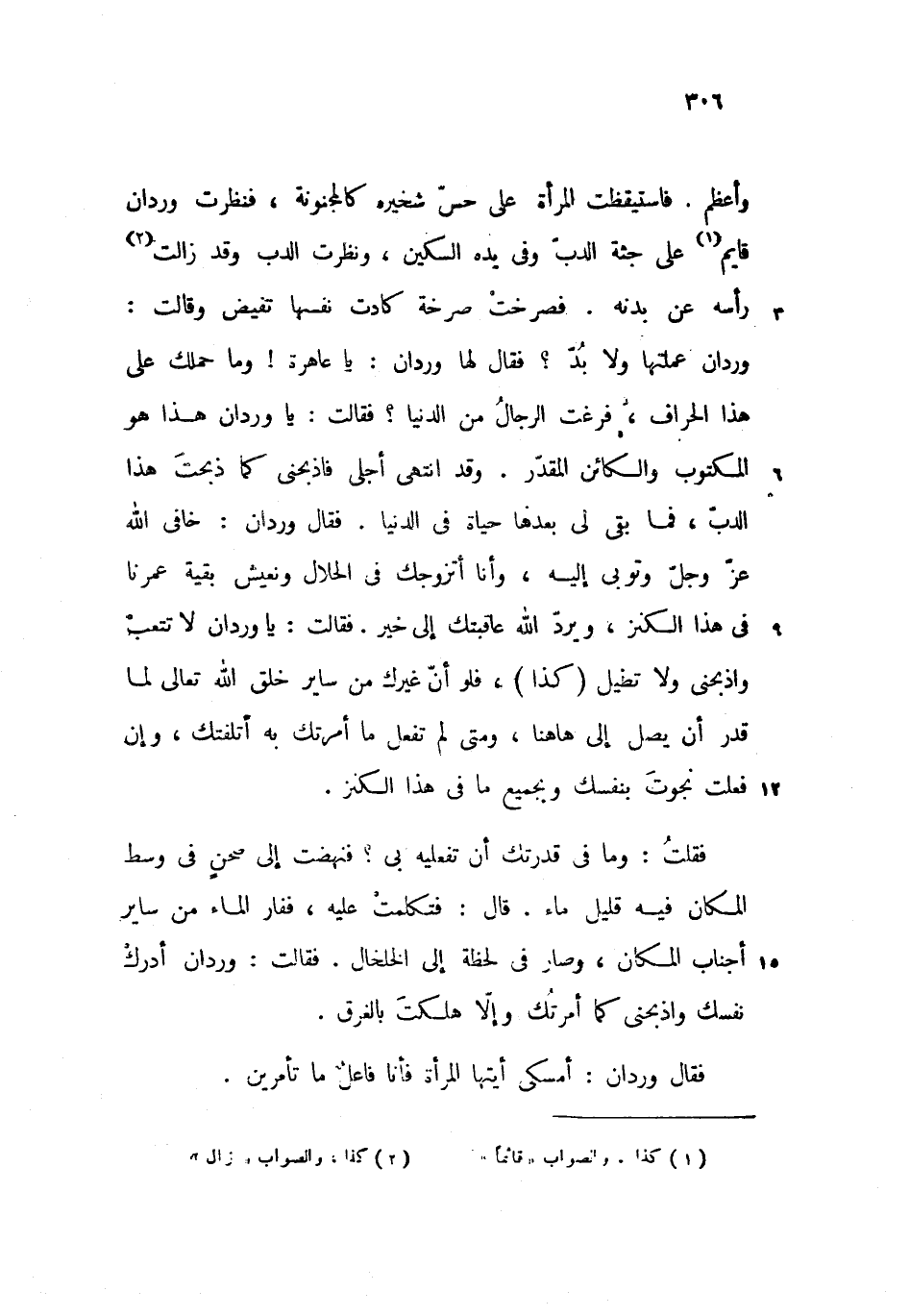وردان عملتها ولا بدّ؟ فقال لها وردان: يا عاهرة! وما حملك على هذا الحراف، فرغت الرجال من الدنيا؟ فقالت: يا وردان هذا هو المكتوب والكائن المقدّر. وقد انتهى أجلى فاذبحنى كما ذبحت هذا الدبّ، فما بقى لى بعدها حياة فى الدنيا. فقال وردان: خافى الله عزّ وجلّ وتوبى إليه، وأنا أتزوجك فى الحلال ونعيش بقية عمرنا فى هذا الكنز، ويردّ الله عاقبتك إلى خير. فقالت: يا وردان لا تتعب واذبحنى ولا تطيل (كذا)، فلو أنّ غيرك من ساير خلق الله تعالى لما قدر أن يصل إلى هاهنا، ومتى لم تفعل ما أمرتك به أتلفتك، وإن فعلت نجوت بنفسك وبجميع ما فى هذا الكنز.