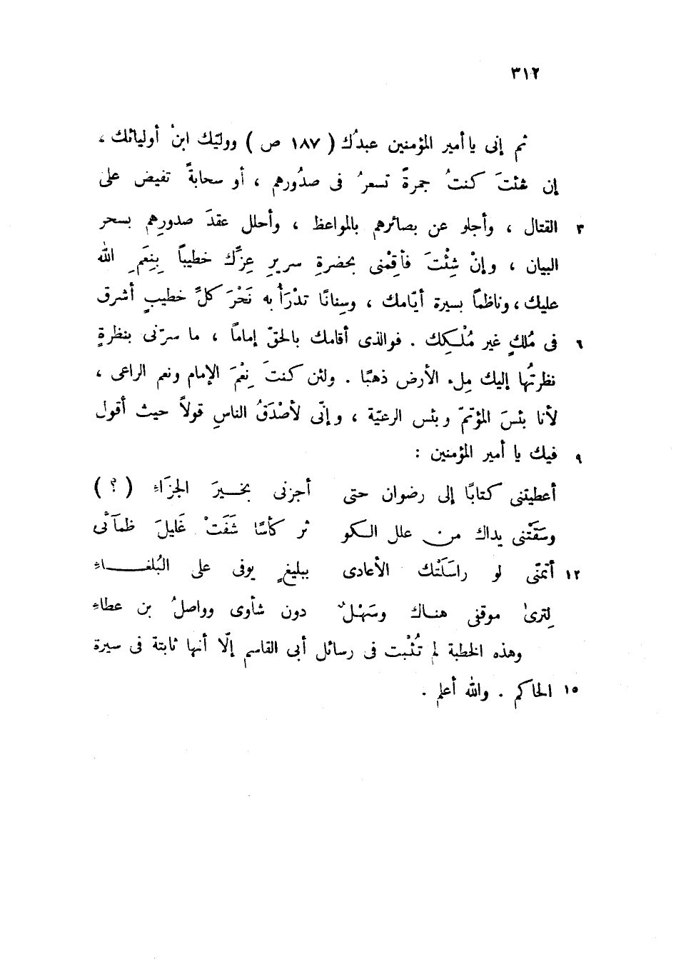 ثم إنى يا أمير المؤمنين عبدك (187 ص) ووليّك ابن أوليائك، إن شئت كنت جمرة تسعر فى صدورهم، أو سحابة تفيض على القتال، وأجلو عن بصائرهم بالمواعظ، وأحلل عقد صدورهم بسحر البيان، وإن شئت فأقمنى بحضرة سرير عزّك خطيبا بنعم الله عليك، وناظما بسيرة أيّامك، وسنانا تدرأ به نحر كلّ خطيب أشرق فى ملك غير ملكك. فو الذى أقامك بالحقّ إماما، ما سرّنى بنظرة نظرتها إليك ملء الأرض ذهبا. ولئن كنت نعم الإمام ونعم الراعى، لأنا بئس المؤتمّ وبئس الرعيّة، وإنّى لأصدق الناس قولا حيث أقول فيك يا أمير المؤمنين: