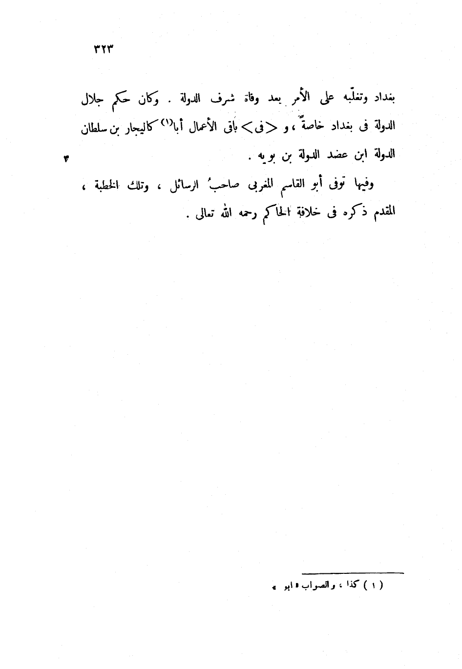 بغداد وتغلّبه على الأمر بعد وفاة شرف الدولة. وكان حكم جلال الدولة فى بغداد خاصة، و <فى> باقى الأعمال أبا كاليجار بن سلطان الدولة ابن عضد الدولة بن بويه.