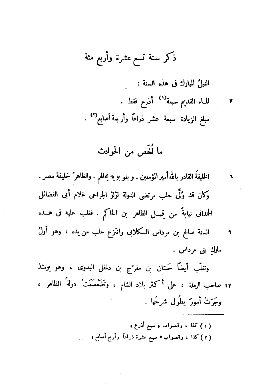 وكان قد ولّى حلب مرتضى الدولة لؤلؤ الجراحى غلام أبى الفضائل الحمدانى نيابة من قبل الظاهر بن الحاكم. فغلب عليه فى هذه السنة صالح بن مرداس الكلابى وانتزع حلب من يده، وهو أول ملوك بنى مرداس.