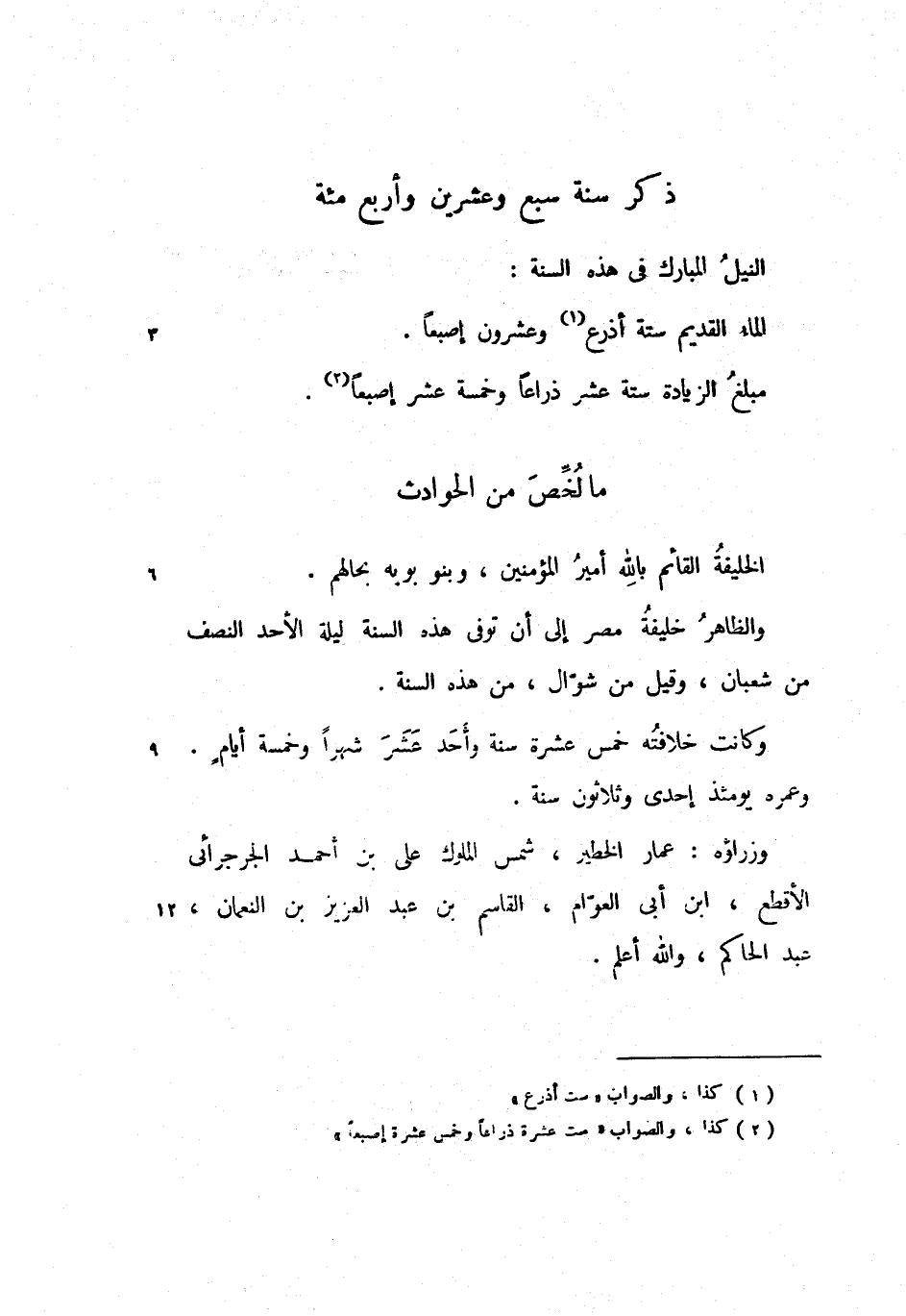 الماء القديم ستة أذرع وعشرون إصبعا.