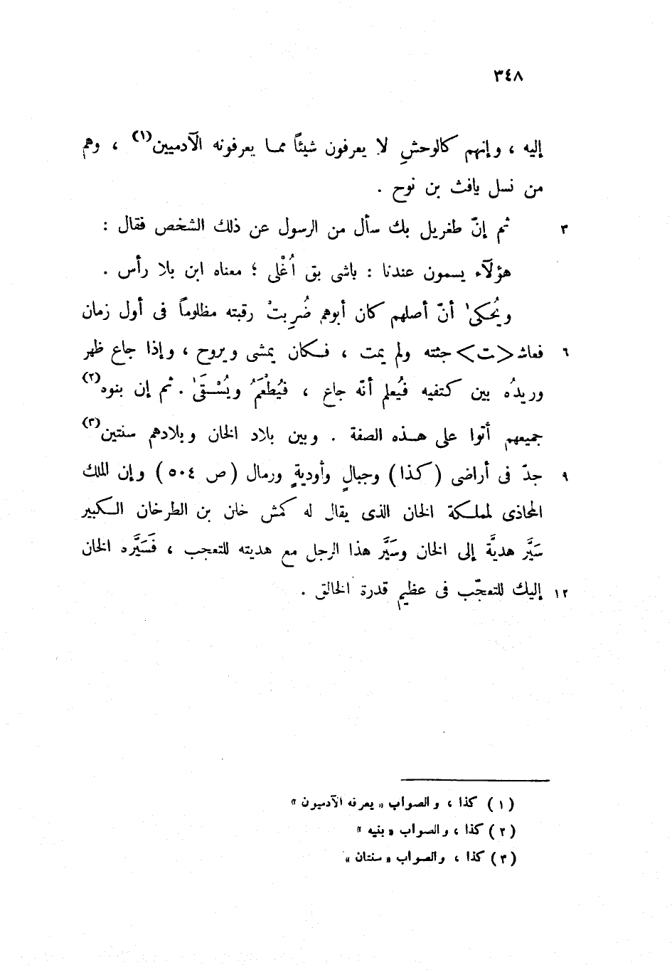 ويحكى أنّ أصلهم كان أبوهم ضربت رقبته مظلوما فى أول زمان فعاش <ت> جثته ولم يمت، فكان يمشى ويروح، وإذا جاع ظهر وريده بين كتفيه فيعلم أنّه جاع، فيطعم ويسقى. ثم إن بنوه جميعهم أتوا على هذه الصفة. وبين بلاد الخان وبلادهم سنتين جدّ فى أراضى (كذا) وجبال وأودية ورمال (ص 504) وإن الملك المحاذى لمملكة الخان الذى يقال له كمش خان بن الطرخان الكبير سيّر هديّة إلى الخان وسيّر هذا الرجل مع هديته للتعجب، فسيّره الخان إليك للتعجّب فى عظيم قدرة الخالق.