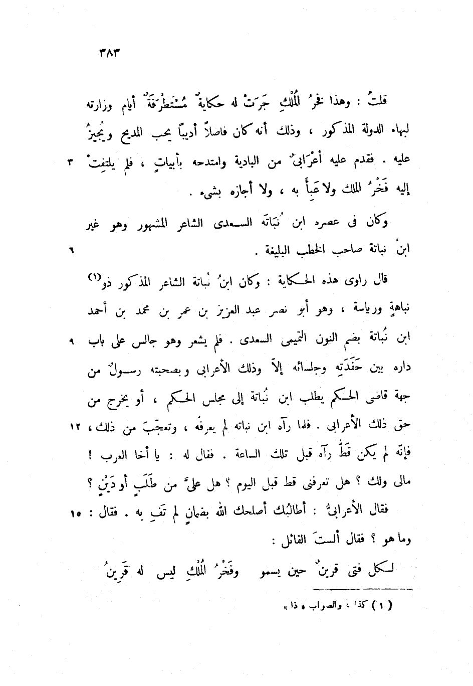 قال راوى هذه الحكاية: وكان ابن نباتة الشاعر المذكور ذو نباهة ورياسة، وهو أبو نصر عبد العزيز بن عمر بن محمد بن أحمد ابن نباتة بضم النون التميمى السعدى. فلم يشعر وهو جالس على باب داره بين حفدته وجلسائه إلاّ وذلك الأعرابى وبصحبته رسول من جهة قاضى الحكم يطلب ابن نباتة إلى مجلس الحكم، أو يخرج من حق ذلك الأعرابى. فلما رآه ابن نباته لم يعرفه، وتعجّب من ذلك، فإنّه لم يكن قطّ رآه قبل تلك الساعة. فقال له: يا أخا العرب! مالى ولك؟ هل تعرفنى قط قبل اليوم؟ هل علىّ من طلب أو دين؟