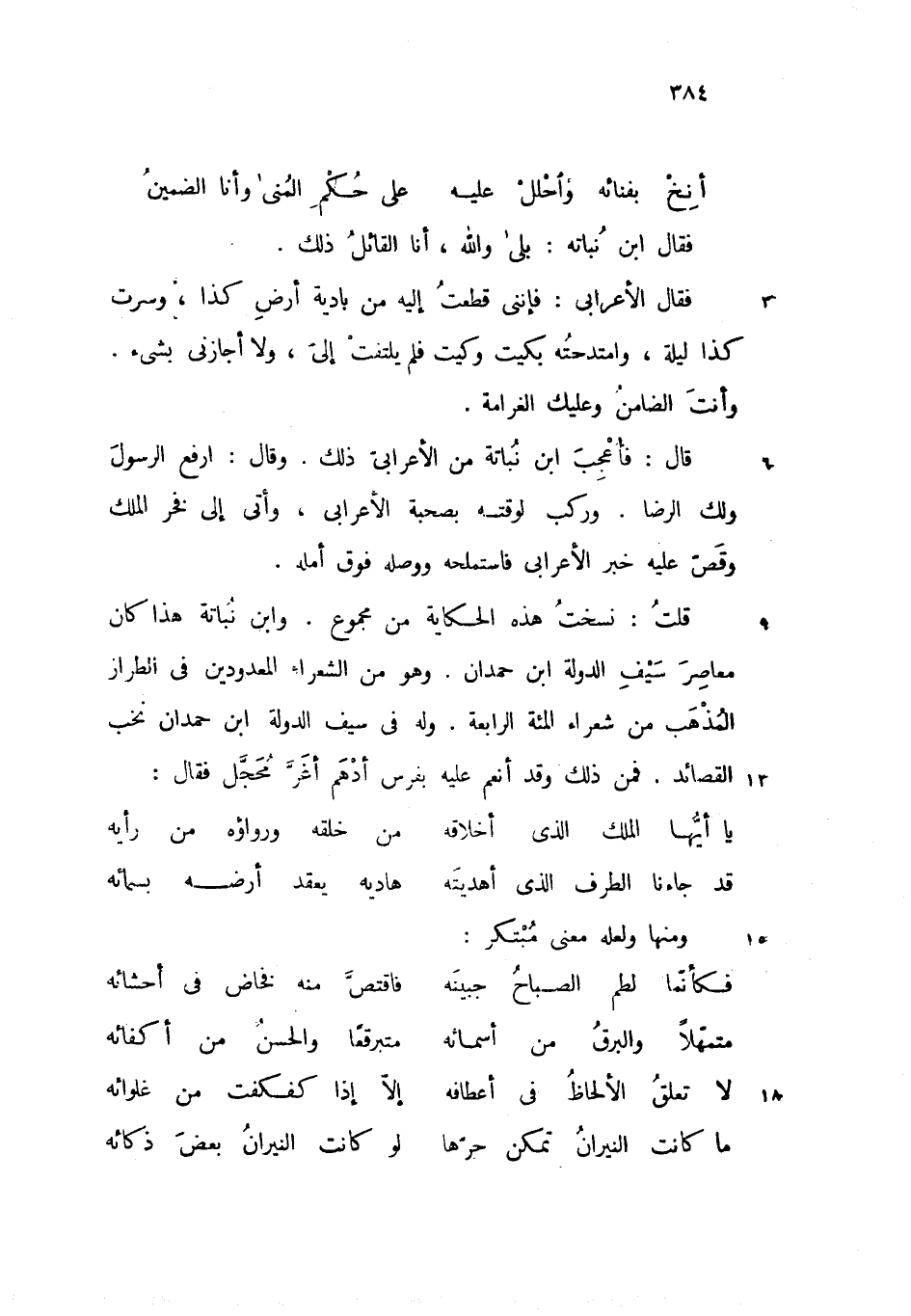 قال: فأعجب ابن نباتة من الأعرابىّ ذلك. وقال: ارفع الرسول ولك الرضا. وركب لوقته بصحبة الأعرابى، وأتى إلى فخر الملك وقصّ عليه خبر الأعرابى فاستملحه ووصله فوق أمله.