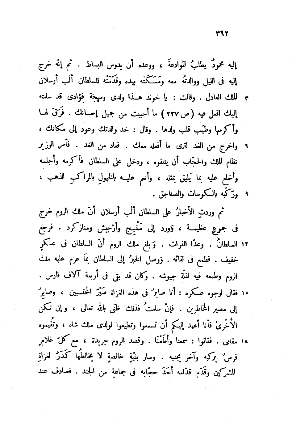 إليه محمود يطلب الموادعة، ووعده أن يدوس البساط. ثم إنّه خرج إليه فى الليل ووالدته معه ومسكته بيده وقدّمته للسلطان ألب أرسلان الملك العادل. وقالت: يا خوند هذا ولدى ومهجة فؤادى قد سلمته إليك افعل فيه (ص 227) ما أحببت من جميل إحسانك. فرقّ لها وأكرمها وطيّب قلب ولدها. وقال: خد والدتك وعود إلى مكانك، وأخرج من الغد لترى ما أفعله معك. فعاد من الغد. فأمر الوزير نظام الملك والحجّاب أن يتلقوه، ودخل على السلطان فأكرمه وأجلسه وأخلع عليه بما يليق بمثله، وأنعم عليه بالخيول بالمراكب الذهب، وركّبه بالكوسات والصناجق.