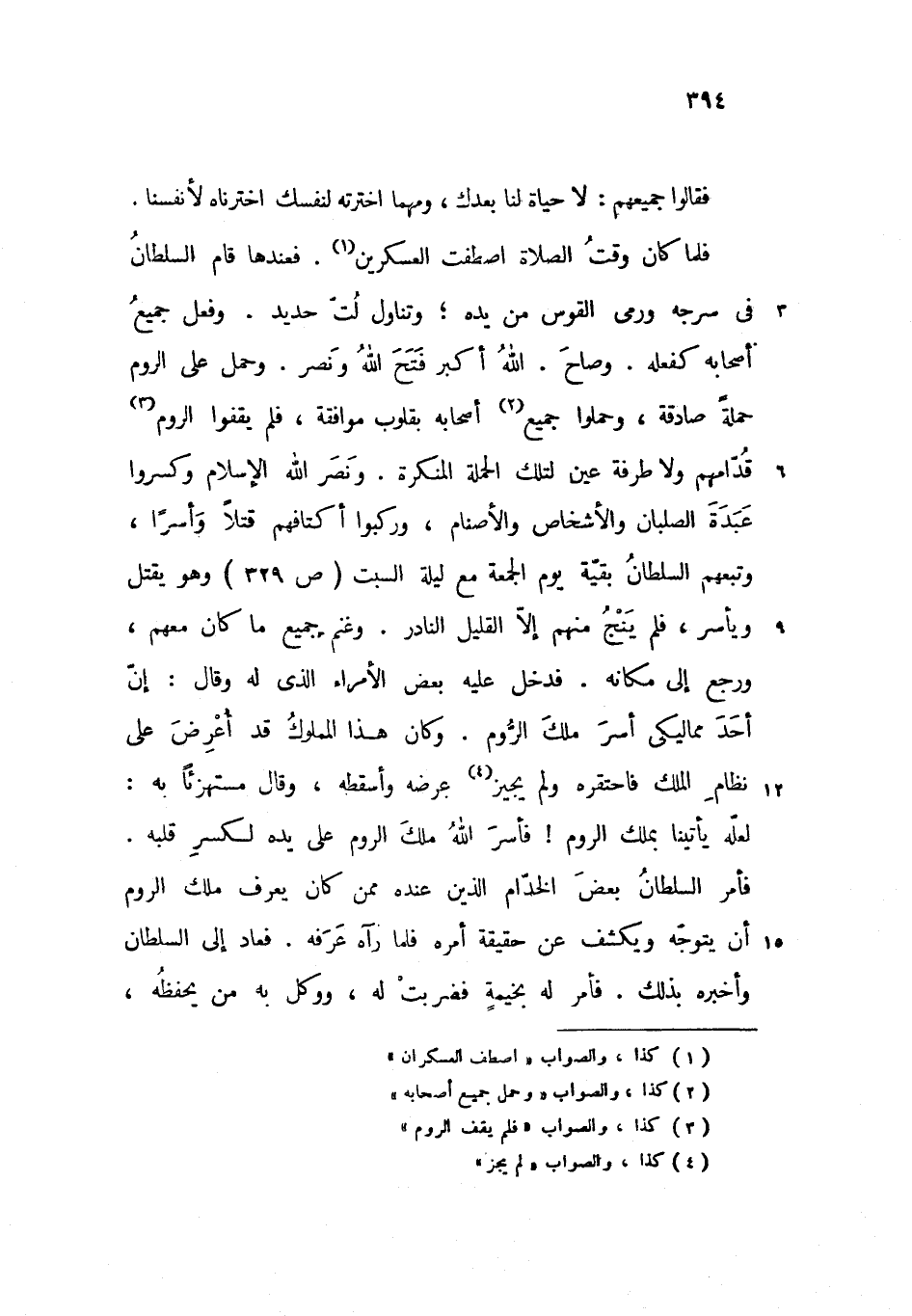 فلما كان وقت الصلاة اصطفت العسكرين. فعندها قام السلطان فى سرجه ورمى القوس من يده؛ وتناول لتّ حديد. وفعل جميع أصحابه كفعله. وصاح. الله أكبر فتح الله ونصر. وحمل على الروم حملة صادقة، وحملوا جميع أصحابه بقلوب موافقة، فلم يقفوا الروم قدّامهم ولا طرفة عين لتلك الحملة المنكرة. ونصر الله الإسلام وكسروا عبدة الصلبان والأشخاص والأصنام، وركبوا أكتافهم قتلا وأسرا، وتبعهم السلطان بقيّة يوم الجمعة مع ليلة السبت (ص 329) وهو يقتل ويأسر، فلم ينج منهم إلاّ القليل النادر. وغنم جميع ما كان معهم، ورجع إلى مكانه. فدخل عليه بعض الأمراء الذى له وقال: إنّ أحد مماليكى أسر ملك الرّوم. وكان هذا المملوك قد أعرض على نظام الملك فاحتقره ولم يجيز عرضه وأسقطه، وقال مستهزئا به: