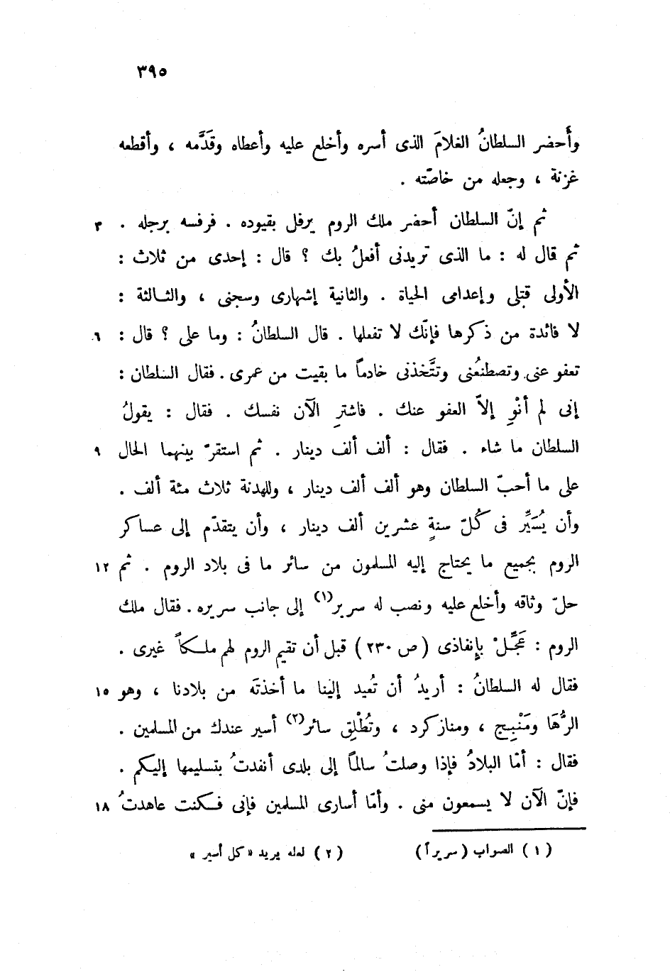 وأن يسيّر فى كلّ سنة عشرين ألف دينار، وأن يتقدّم إلى عساكر الروم بجميع ما يحتاج إليه المسلمون من سائر ما فى بلاد الروم. ثم حلّ وثاقه وأخلع عليه ونصب له سرير إلى جانب سريره. فقال ملك الروم: عجّل بإنفاذى (ص 230) قبل أن تقيم الروم لهم ملكا غيرى.