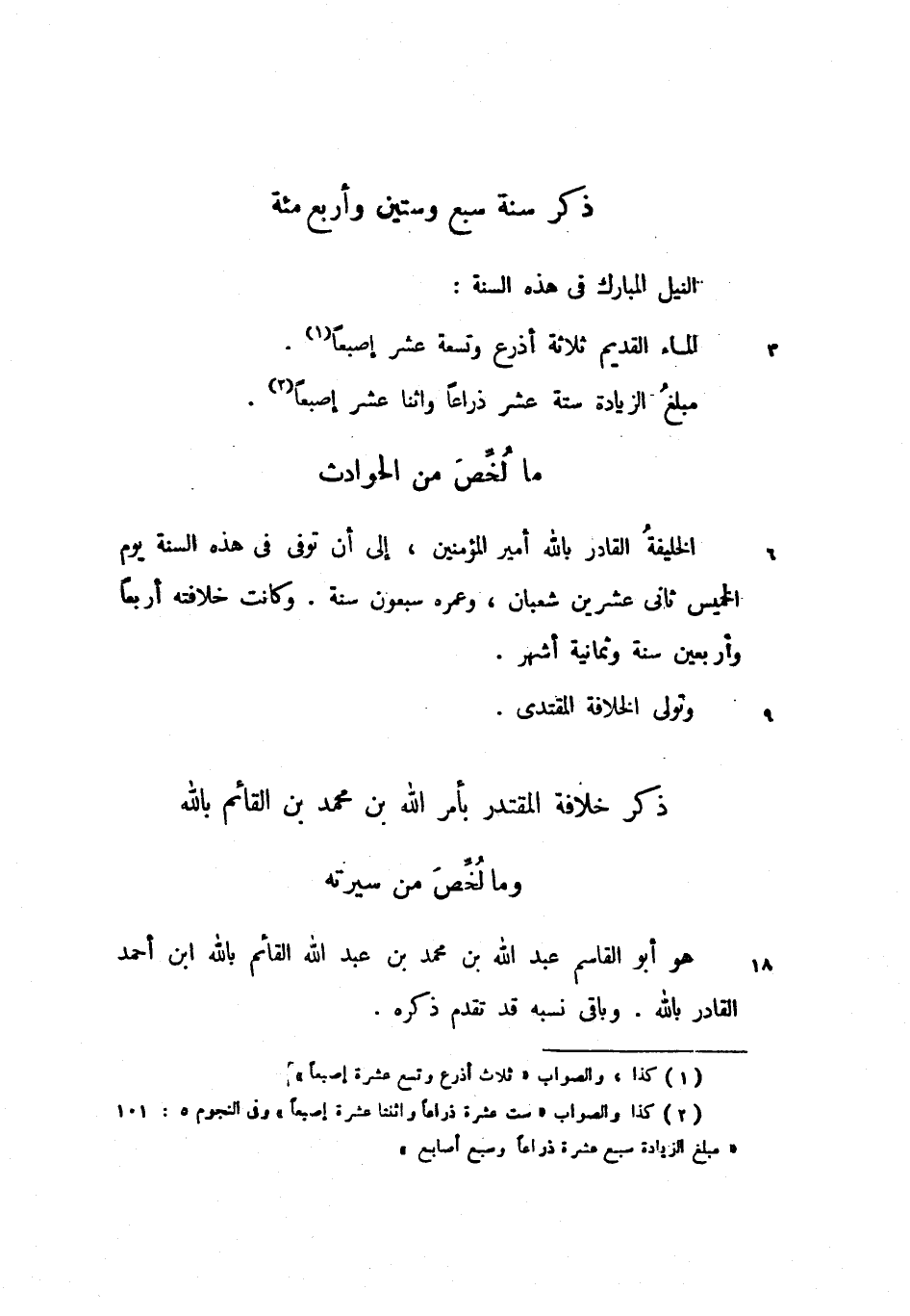 الخليفة القادر بالله أمير المؤمنين، إلى أن توفى فى هذه السنة يوم الخميس ثانى عشرين شعبان، وعمره سبعون سنة. وكانت خلافته أربعا وأربعين سنة وثمانية أشهر.