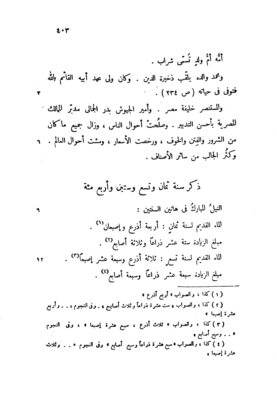 والمستنصر خليفة مصر. وأمير الجيوش بدر الجمالى مدبّر الممالك المصرية بأحسن التدبير. وصلحت أحوال الناس، وزال جميع ما كان من الشرور والفتن والخوف، ورخصت الأسعار، ومشت أحوال العالم.