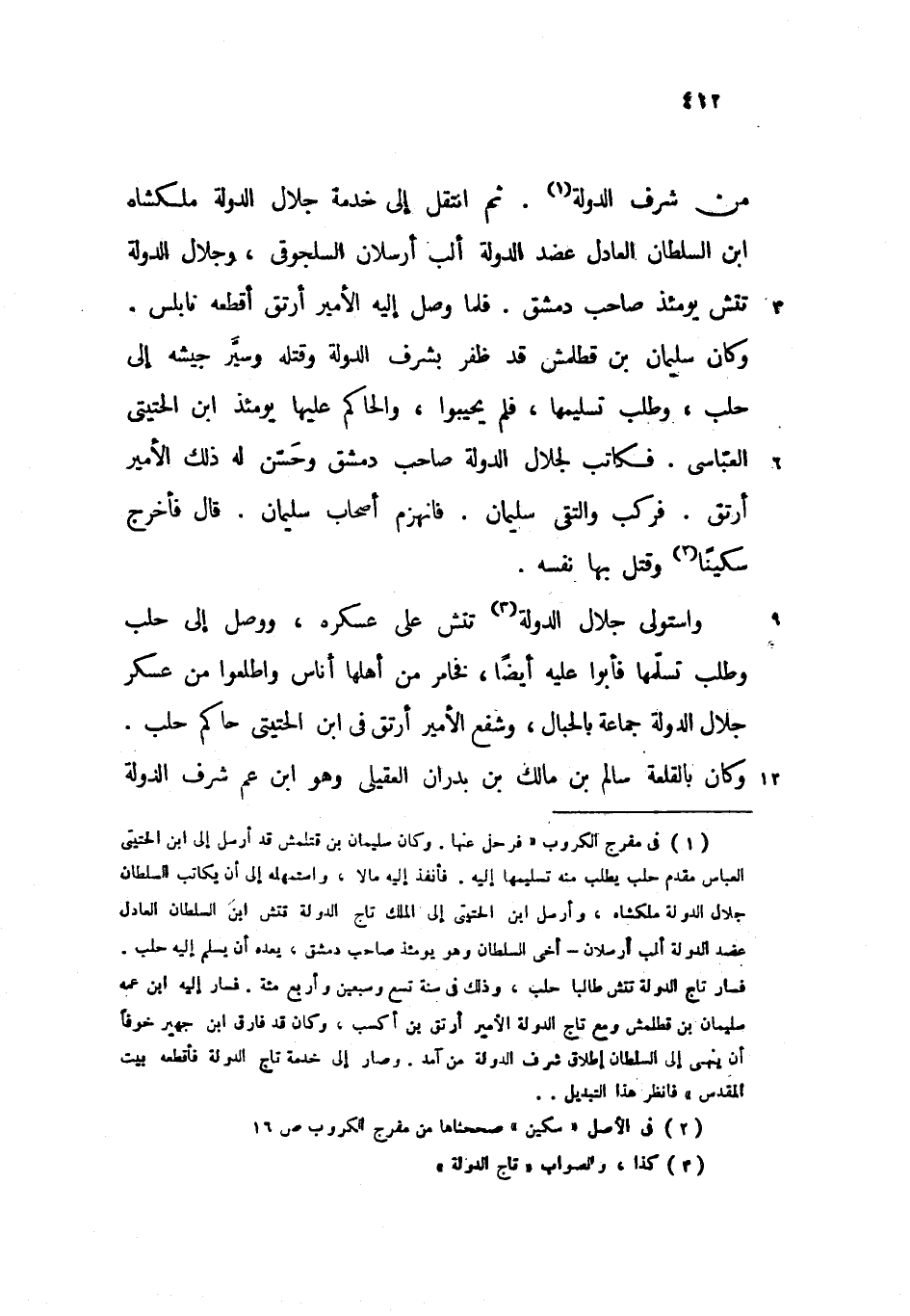 وكان سليمان بن قطلمش قد ظفر بشرف الدولة وقتله وسيّر جيشه إلى حلب، وطلب تسليمها، فلم يحيبوا، والحاكم عليها يومئذ ابن الحتيتى العبّاسى. فكاتب لجلال الدولة صاحب دمشق وحسّن له ذلك الأمير أرتق. فركب والتقى سليمان. فانهزم أصحاب سليمان. قال فأخرج سكينا وقتل بها نفسه.