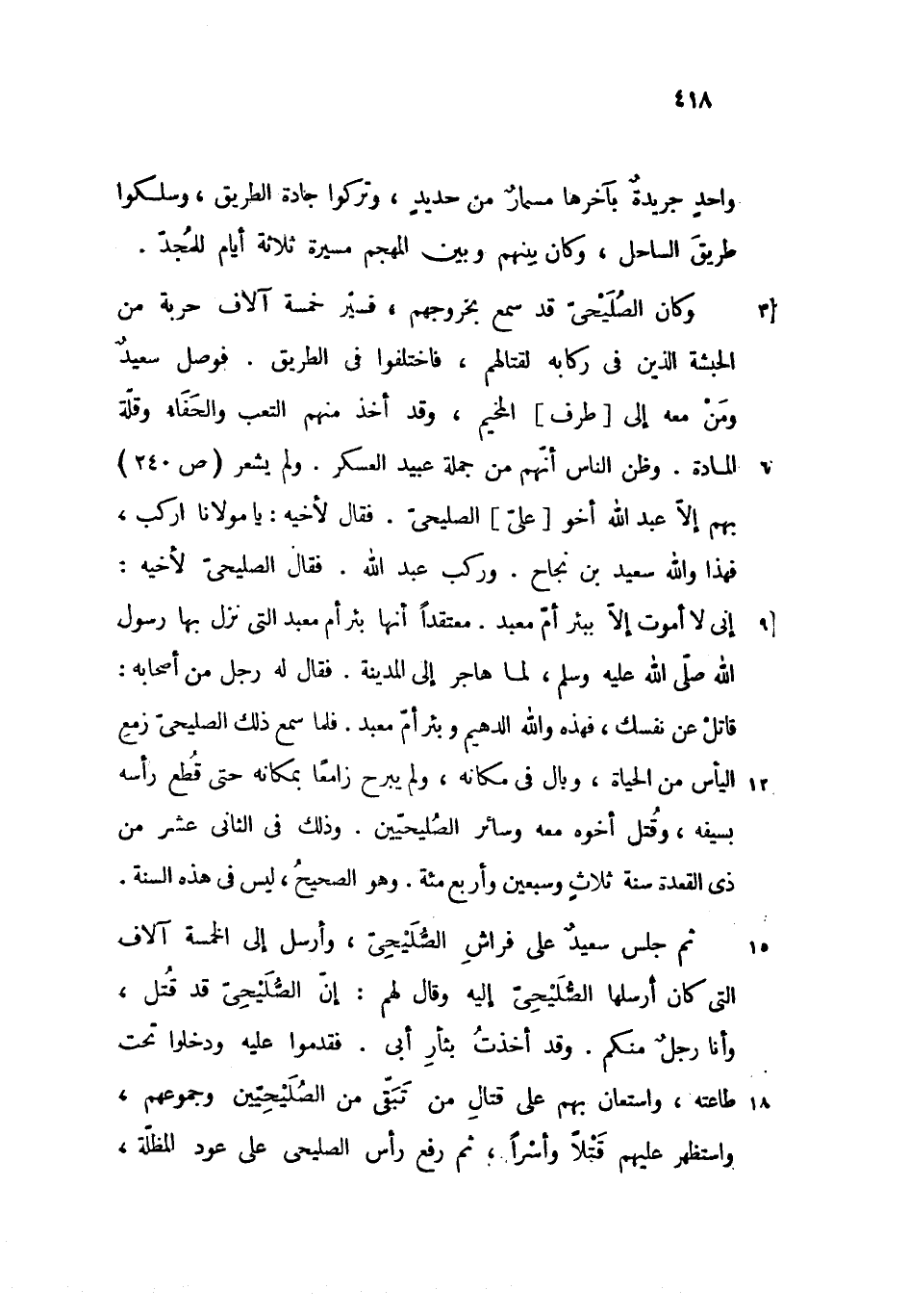 وكان الصليحىّ قد سمع بخروجهم، فسيّر خمسة آلاف حربة من الحبشة الذين فى ركابه لقتالهم، فاختلفوا فى الطريق. فوصل سعيد ومن معه إلى [طرف] المخيم، وقد أخذ منهم التعب والحفاء وقلّة المادة. وظن الناس أنّهم من جملة عبيد العسكر. ولم يشعر (ص 240) بهم إلاّ عبد الله أخو [علىّ] الصليحىّ. فقال لأخيه: يا مولانا اركب، فهذا والله سعيد بن نجاح. وركب عبد الله. فقال الصليحىّ لأخيه:
