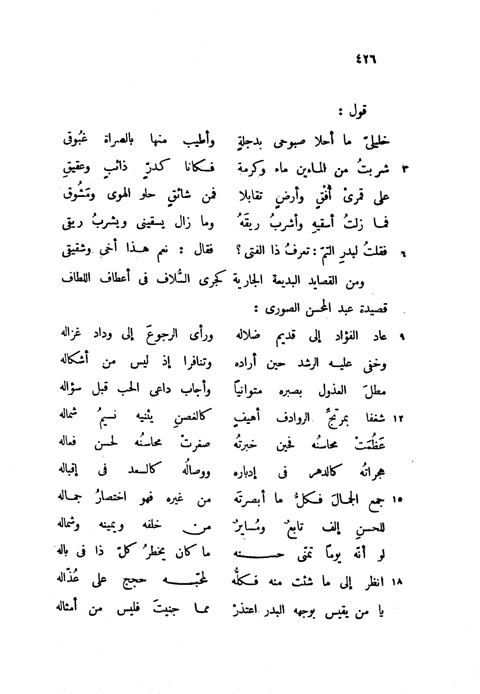 ومن القصايد البديعة الجارية كجرى السّلاف فى أعطاف اللطاف قصيدة عبد المحسن الصورى: