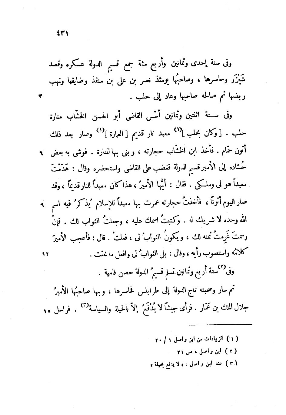 وفى سنة اثنتين وثمانين أسّس القاضى أبو الحسن الخشّاب منارة حلب. [وكان بحلب] معبد نار قديم [العمارة] وصار بعد ذلك أتون حمّام. فأخذ ابن الخشّاب حجارته، وبنى بها المنارة. فوشى به بعض حسّاده إلى الأمير قسيم الدولة فغضب على القاضى واستحضره وقال: هدمت معبدا هو لى وملكى. فقال: أيّها الأمير، هذا كان معبدا للنار قديما، وقد صار اليوم أتونا، فأخذت حجارته عمرت بها معبدا للإسلام يذكر فيه اسم الله وحده لا شريك له. وكتبت اسمك عليه، وجعلت الثواب لك. فإن رسمت غرمت ثمنه لك، ويكون الثواب لى، فعلت. قال: فأعجب الأمير كلامه واستصوب رأيه، وقال: بل الثواب لى وافعل ما شئت.