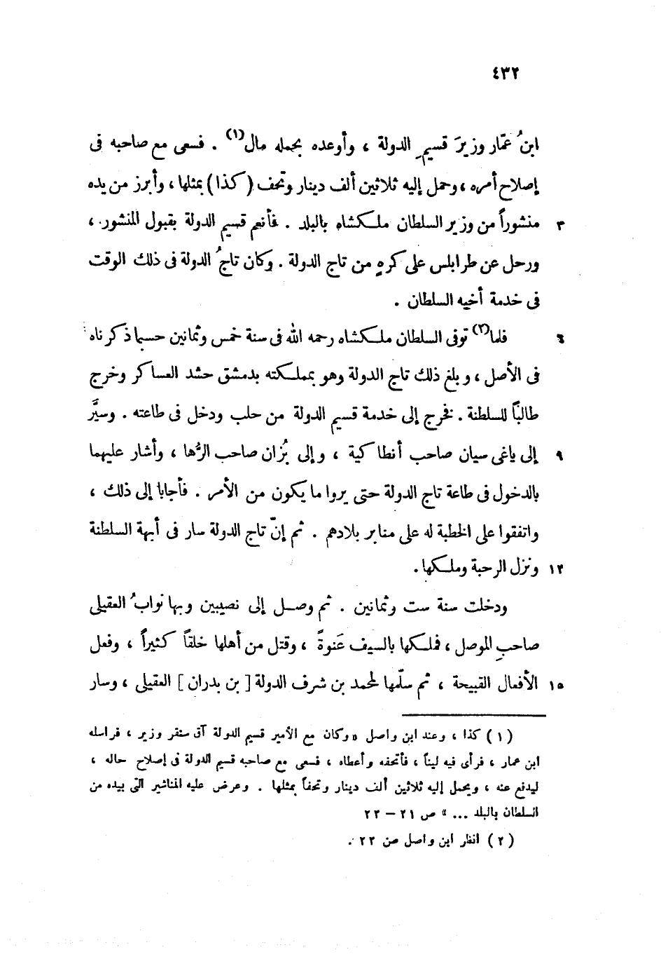 ابن عمّار وزير قسيم الدولة، وأوعده بحمله مال. فسعى مع صاحبه فى إصلاح أمره، وحمل إليه ثلاثين ألف دينار وتحف (كذا) بمثلها، وأبرز من يده منشورا من وزير السلطان ملكشاه بالبلد. فأنعم قسيم الدولة بقبول المنشور، ورحل عن طرابلس على كره من تاج الدولة. وكان تاج الدولة فى ذلك الوقت فى خدمة أخيه السلطان.