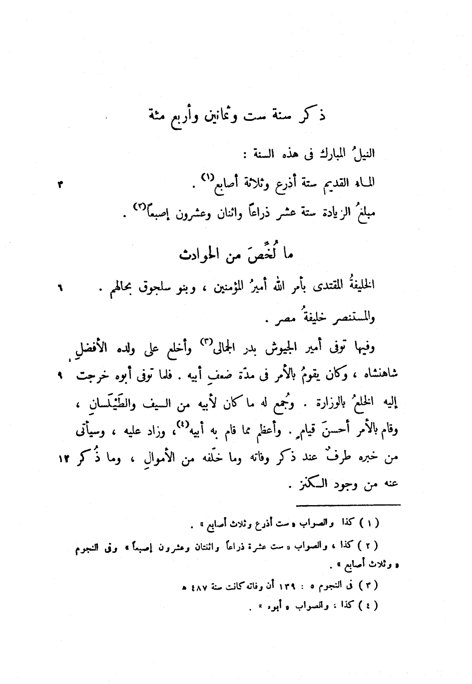 وفيها توفى أمير الجيوش بدر الجمالى وأخلع على ولده الأفضل شاهنشاه، وكان يقوم بالأمر فى مدّة ضعف أبيه. فلما توفى أبوه خرجت إليه الخلع بالوزارة. وجمع له ما كان لأبيه من السيف والطيلسان، وقام بالأمر أحسن قيام. وأعظم مما قام به أبيه، وزاد عليه، وسيأتى من خبره طرف عند ذكر وفاته وما خلّفه من الأموال، وما ذكر عنه من وجود الكنز.
