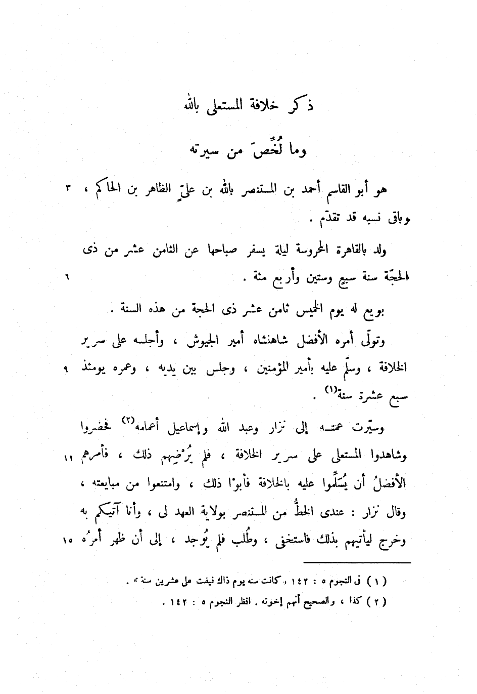وسيّرت عمته إلى نزار وعبد الله وإسماعيل أعمامه فحضروا وشاهدوا المستعلى على سرير الخلافة، فلم يرضهم ذلك، فأمرهم الأفضل أن يسلّموا عليه بالخلافة فأبوا ذلك، وامتنعوا من مبايعته، وقال نزار: عندى الخطّ من المستنصر بولاية العهد لى، وأنا آتيكم به وخرج ليأتيهم بذلك فاستخفى، وطلب فلم يوجد، إلى أن ظهر أمره