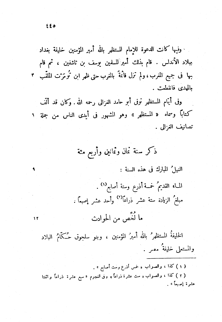 وفيها كانت الدعوة للإمام المستظهر بالله أمير المؤمنين خليفة بغداد ببلاد الأندلس. قام بذلك أمير المسلمين يوسف بن تاشفين، ثم قام بها فى جميع المغرب، ولم تزل قائمة بالمغرب حتى ظهر ابن تومرت الملّقب بالمهدى فانقطعت.