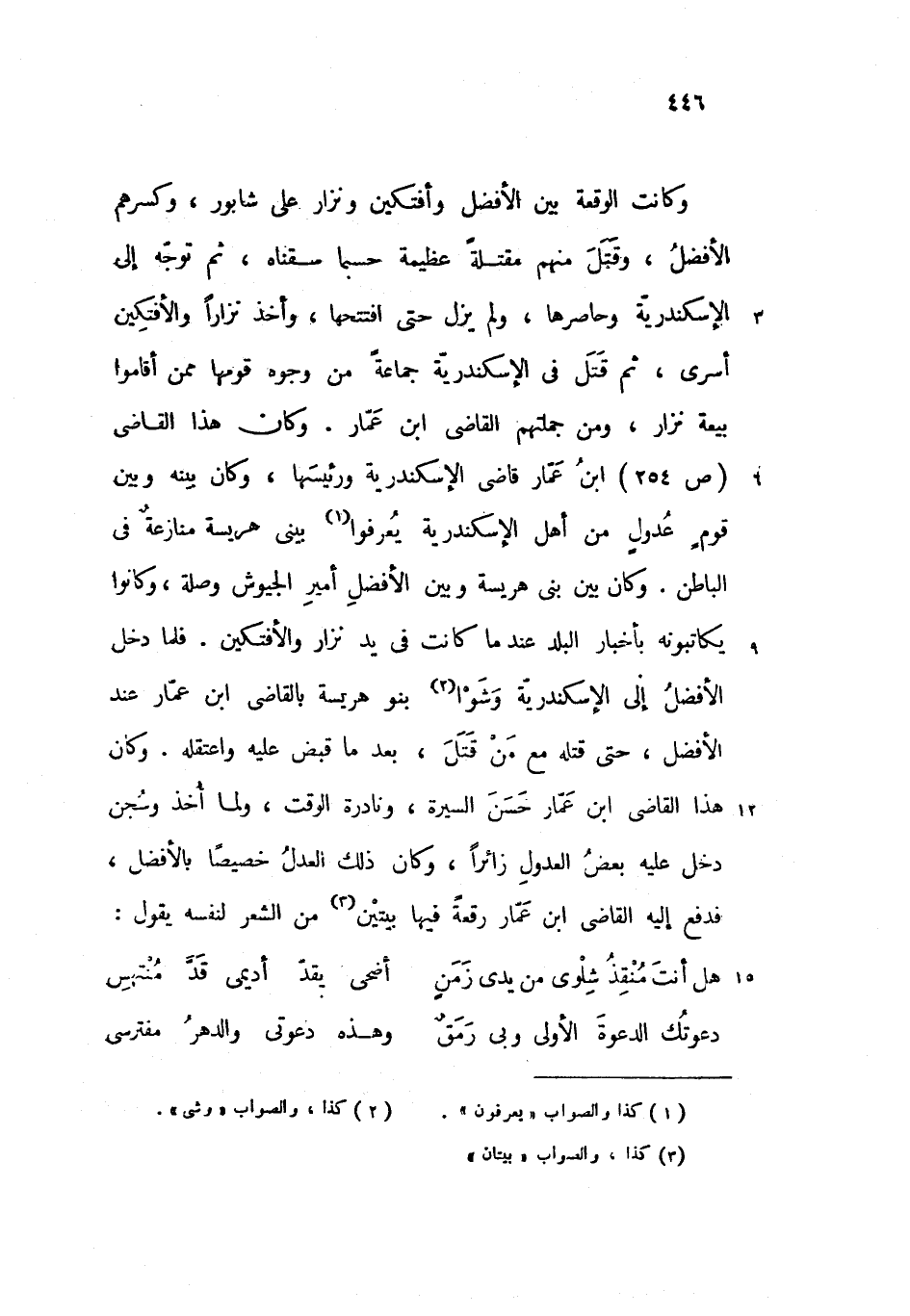 وكانت الوقعة بين الأفضل وأفتكين ونزار على شابور، وكسرهم الأفضل، وقتل منهم مقتلة عظيمة حسبما سقناه، ثم توجّه إلى الإسكندريّة وحاصرها، ولم يزل حتى افتتحها، وأخذ نزارا والأفتكين أسرى، ثم قتل فى الإسكندريّة جماعة من وجوه قومها ممن أقاموا بيعة نزار، ومن جملتهم القاضى ابن عمّار. وكان هذا القاضى (ص 254) ابن عمّار قاضى الإسكندرية ورئيسها، وكان بينه وبين قوم عدول من أهل الإسكندرية يعرفوا بينى هريسة منازعة فى الباطن. وكان بين بنى هريسة وبين الأفضل أمير الجيوش وصلة، وكانوا يكاتبونه بأخبار البلد عند ما كانت فى يد نزار والأفتكين. فلما دخل الأفضل إلى الإسكندريّة وشوا بنو هريسة بالقاضى ابن عمّار عند الأفضل، حتى قتله مع من قتل، بعد ما قبض عليه واعتقله. وكان هذا القاضى ابن عمّار حسن السيرة، ونادرة الوقت، ولما أخذ وسجن دخل عليه بعض العدول زائرا، وكان ذلك العدل خصيصا بالأفضل، فدفع إليه القاضى ابن عمّار رقعة فيها بيتين من الشعر لنفسه يقول: