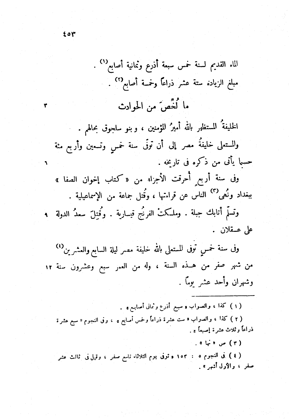 وفى سنة أربع أحرقت الأجزاء من «كتاب إخوان الصفا» ببغداد ونهى الناس عن قراءتها، وقتل جماعة من الإسماعيلية.