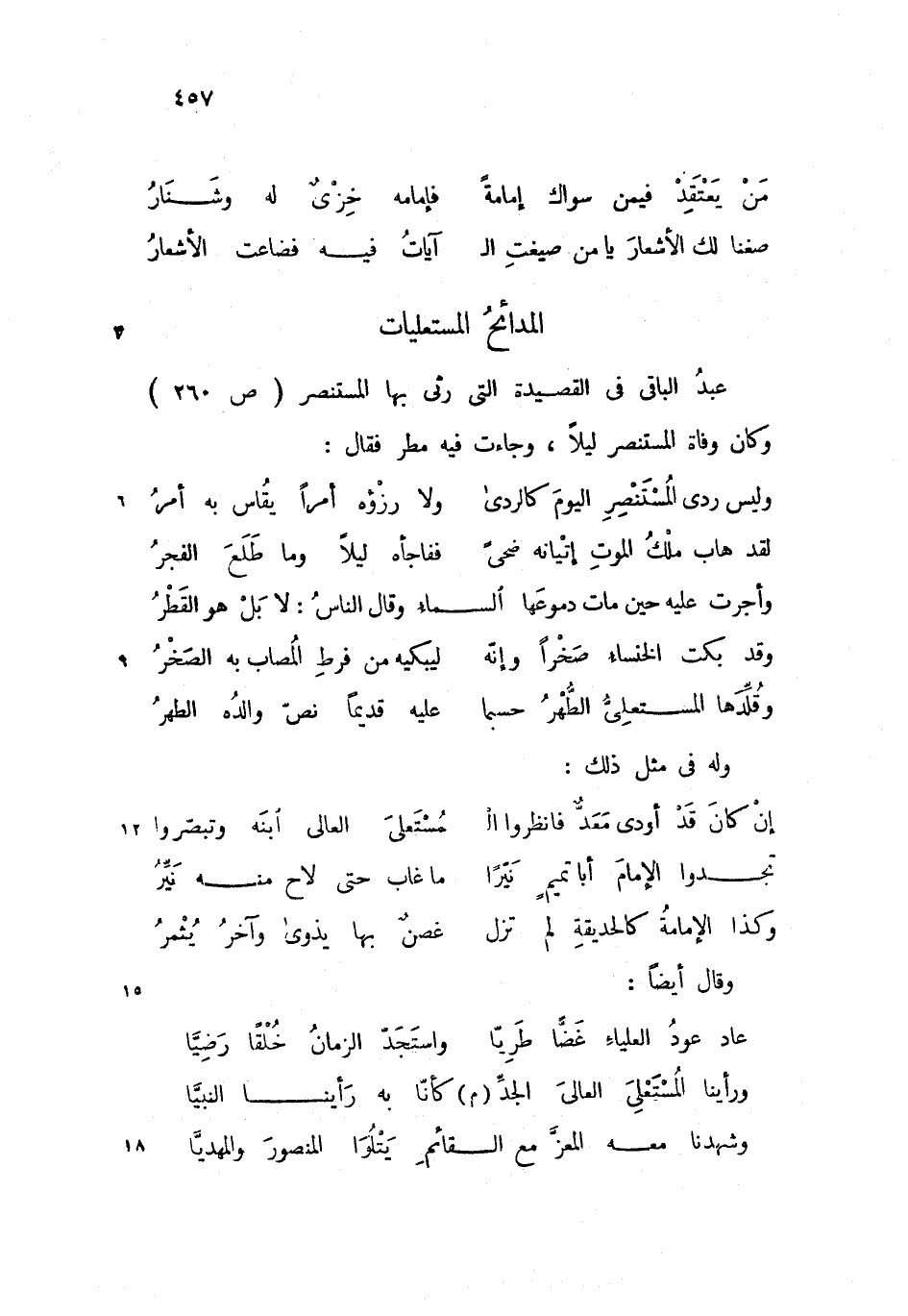 عبد الباقى فى القصيدة التى رثى بها المستنصر (ص 260) وكان وفاة المستنصر ليلا، وجاءت فيه مطر فقال: