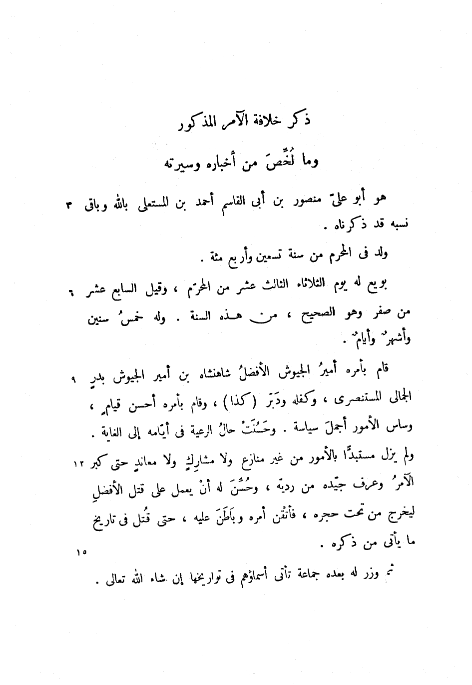 ولم يزل مستبدّا بالأمور من غير منازع ولا مشارك ولا معاند حتى كبر الآمر وعرف جيّده من رديّه، وحسّن له أن يعمل على قتل الأفضل ليخرج من تحت حجره، فأتقن أمره وباطن عليه، حتى قتل فى تاريخ ما يأتى من ذكره.