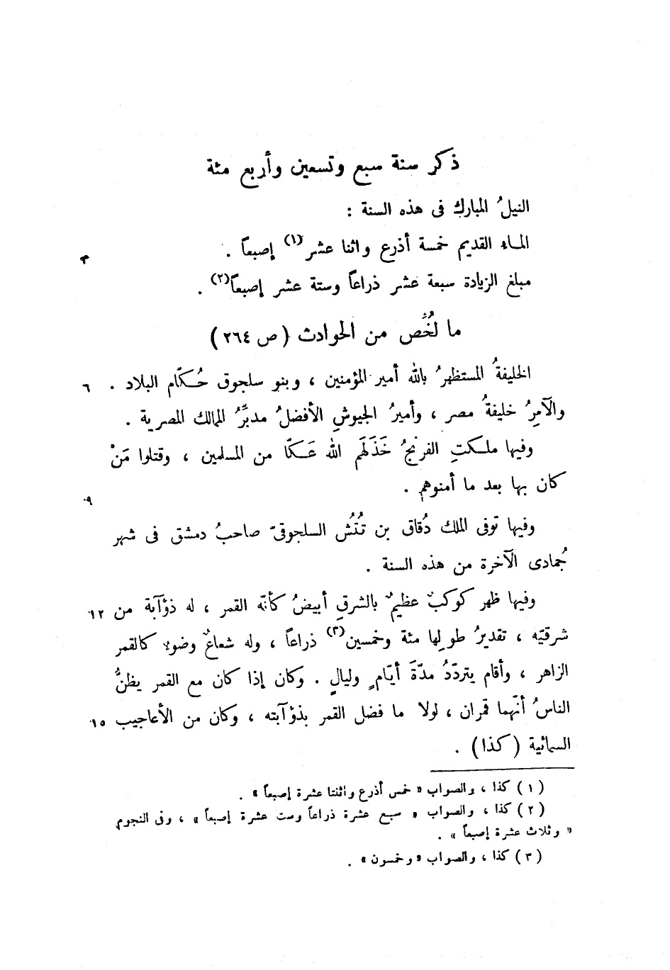 وفيها ظهر كوكب عظيم بالشرق أبيض كأنّه القمر، له ذؤآبة من شرقيّه، تقدير طولها مئة وخمسين ذراعا، وله شعاع وضوء كالقمر الزاهر، وأقام يتردّد مدّة أيّام وليال. وكان إذا كان مع القمر يظنّ الناس أنّهما قمران، لولا ما فضل القمر بذؤآبته، وكان من الأعاجيب السمائية (كذا).