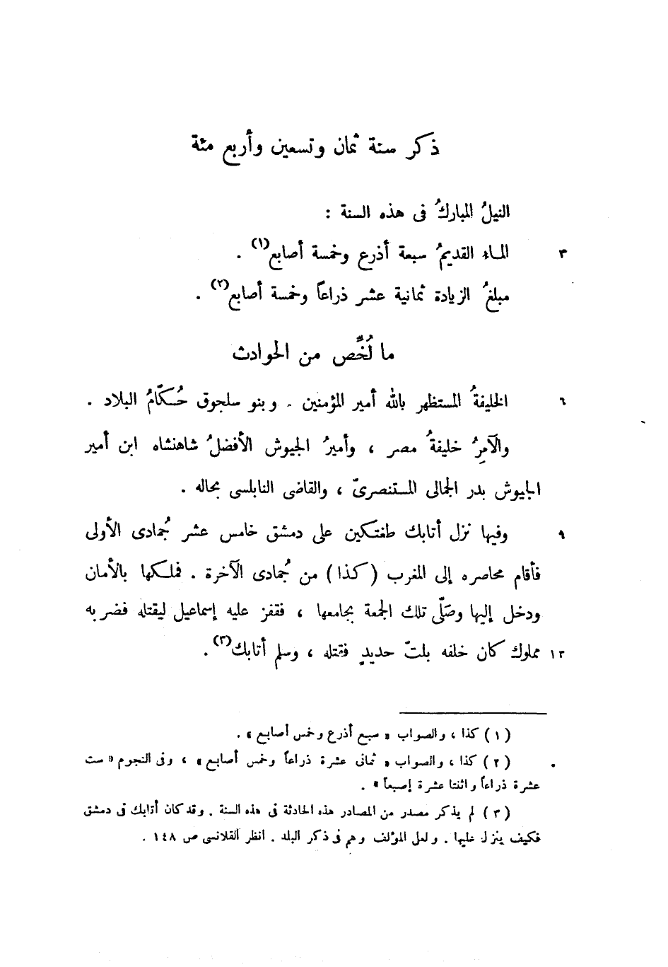وفيها نزل أتابك طغتكين على دمشق خامس عشر جمادى الأولى فأقام محاصره إلى المغرب (كذا) من جمادى الآخرة. فملكها بالأمان ودخل إليها وصلّى تلك الجمعة بجامعها، فقفز عليه إسماعيل ليقتله فضربه مملوك كان خلفه بلتّ حديد فقتله، وسلم أتابك.