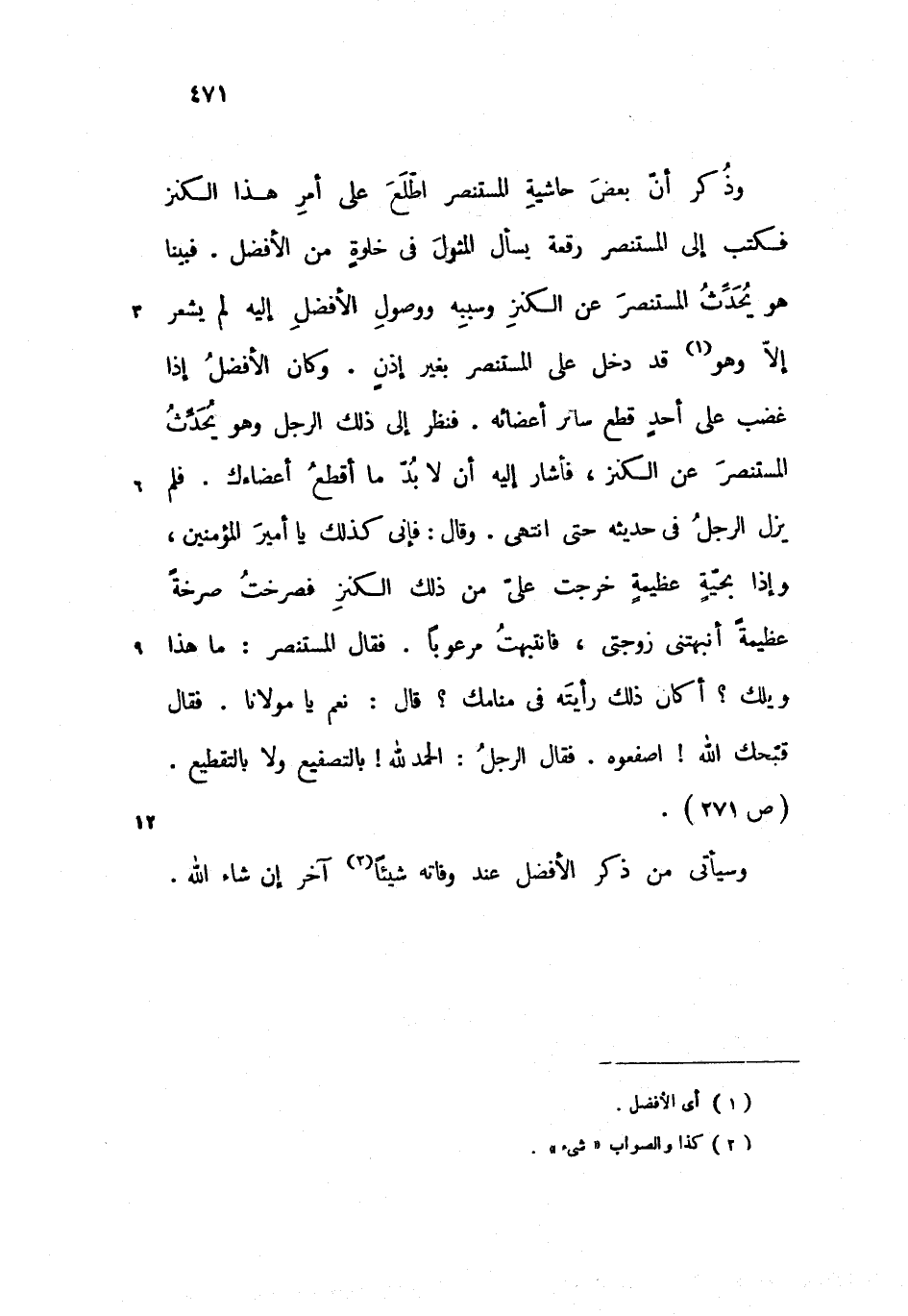 وذكر أنّ بعض حاشية المستنصر اطّلع على أمر هذا الكنز فكتب إلى المستنصر رقعة يسأل المثول فى خلوة من الأفضل. فبينا هو يحدّث المستنصر عن الكنز وسببه ووصول الأفضل إليه لم يشعر إلاّ وهو قد دخل على المستنصر بغير إذن. وكان الأفضل إذا غضب على أحد قطع سائر أعضائه. فنظر إلى ذلك الرجل وهو يحدّث المستنصر عن الكنز، فأشار إليه أن لا بدّ ما أقطع أعضاءك. فلم يزل الرجل فى حديثه حتى انتهى. وقال: فإنى كذلك يا أمير المؤمنين، وإذا بحيّة عظيمة خرجت علىّ من ذلك الكنز فصرخت صرخة عظيمة أنبهتنى زوجتى، فانتبهت مرعوبا. فقال المستنصر: ما هذا ويلك؟ أكان ذلك رأيته فى منامك؟ قال: نعم يا مولانا. فقال قبّحك الله! اصفعوه. فقال الرجل: الحمد لله! بالتصفيع ولا بالتقطيع.