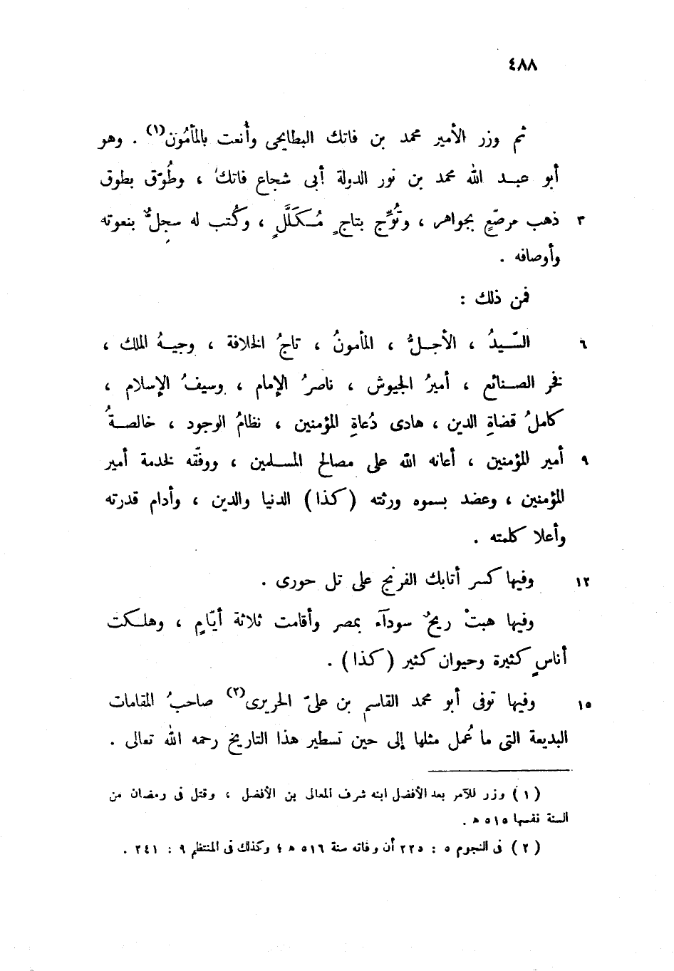وفيها توفى أبو محمد القاسم بن علىّ الحريرى صاحب المقامات البديعة التى ما عمل مثلها إلى حين تسطير هذا التاريخ رحمه الله تعالى.