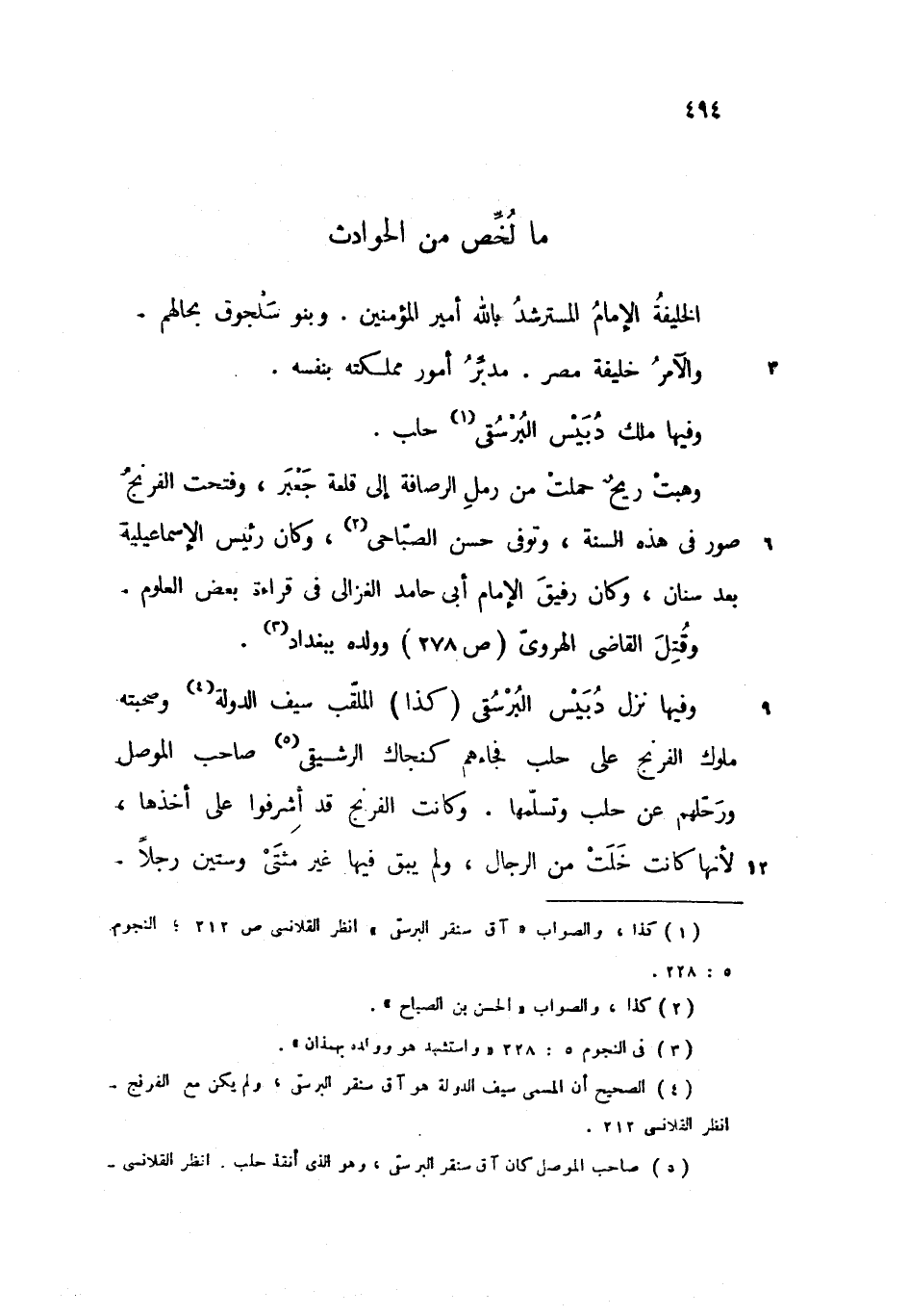وفيها نزل دبيس البرسقى (كذا) الملقّب سيف الدولة وصحبته ملوك الفرنج على حلب فجاءهم كنجاك الرشيقى صاحب الموصل ورحّلهم عن حلب وتسلّمها. وكانت الفرنج قد أشرفوا على أخذها، لأنها كانت خلت من الرجال، ولم يبق فيها غير مئتى وستين رجلا.