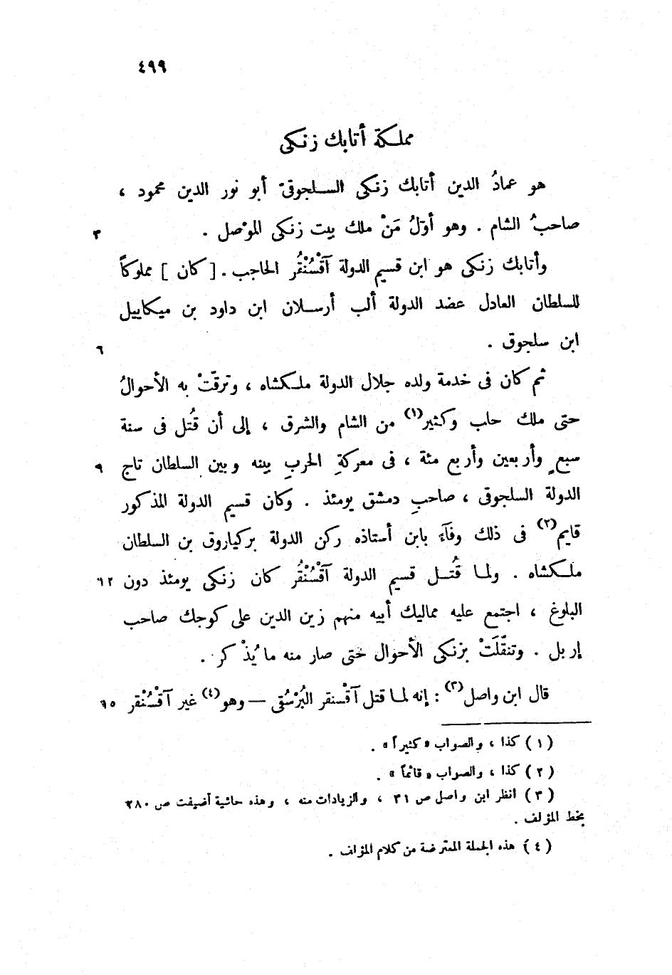 وأتابك زنكى هو ابن قسيم الدولة آقسنقر الحاجب. [كان] مملوكا للسلطان العادل عضد الدولة ألب أرسلان ابن داود بن ميكاييل ابن سلجوق.