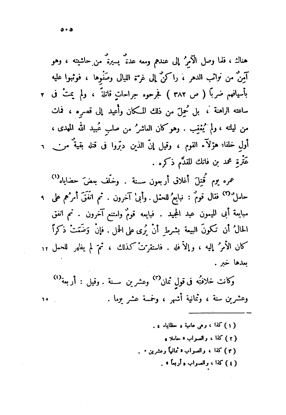 هناك، فلما وصل الآمر إلى عندهم ومعه عدة يسيرة من حاشيته، وهو آمن من نوائب الدهر، راكن إلى غرّة الليالى وصفوها، فوثبوا عليه بأسيافهم ضربا (ص 382) فجرحوه جراحات قاتلة، ولم يمت فى ساعته الراهنة، بل حمل من ذلك المكان وأعيد إلى قصره، فمات من ليلته، ولم يعقب. وهو كان العاشر من صلب عبيد الله المهدى، أول خلفاء هؤلآء القوم، وقيل إنّ الذين دبّروا فى قتله بقية من عترة محمد بن فاتك المقدّم ذكره.