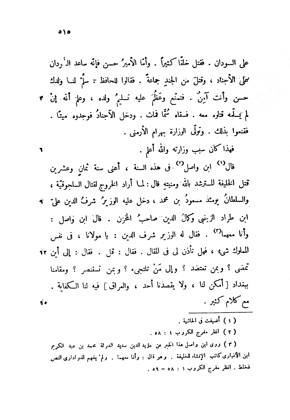 وأنا معهما. فقال له الوزير شرف الدين: يا مولانا، فى نفس المملوك شئ، فهل تأذن لى فى المقال. فقال: قل. فقال: إلى أين تمضى؟ وبمن تعتضد؟ وإلى من تلتجئ؟ وبمن تستنصر؟ ومقامنا ببغداد [أمكن لنا، ولا يقصدنا أحد، والعراق] فيه لنا الكفاية.