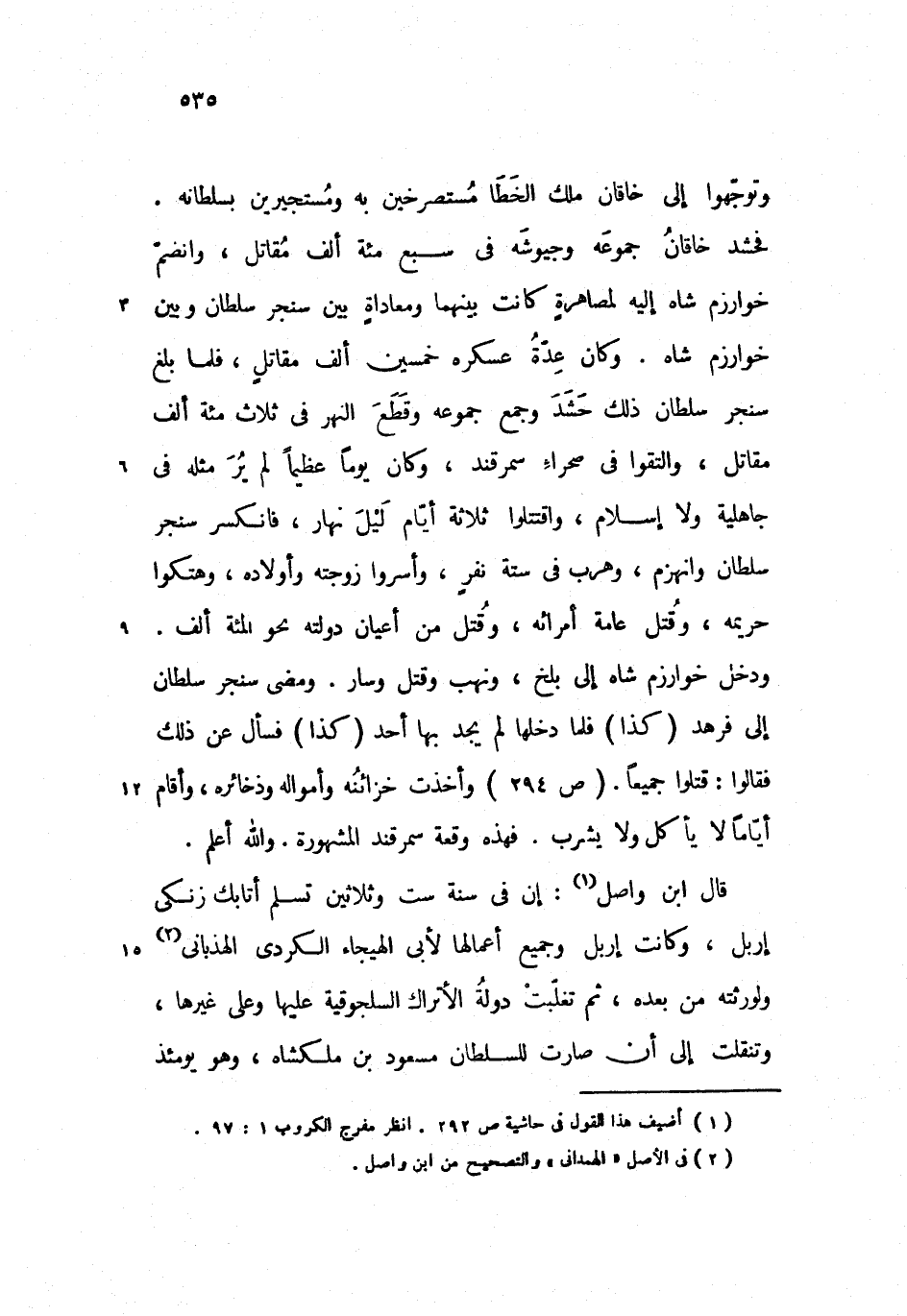 ودخل خوارزم شاه إلى بلخ، ونهب وقتل وسار. ومضى سنجر سلطان إلى فرهد (كذا) فلما دخلها لم يجد بها أحد (كذا) فسأل عن ذلك فقالوا: قتلوا جميعا. (ص 294) وأخذت خزائنه وأمواله وذخائره، وأقام أيّاما لا يأكل ولا يشرب. فهذه وقعة سمرقند المشهورة. والله أعلم.
