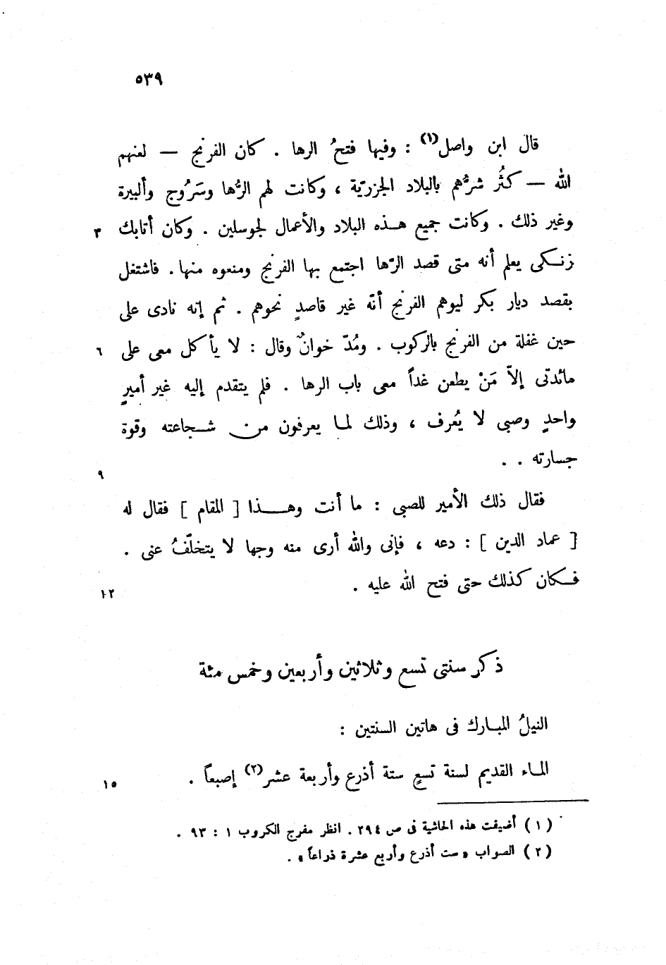 قال ابن واصل: وفيها فتح الرها. كان الفرنج-لعنهم الله-كثر شرّهم بالبلاد الجزريّة، وكانت لهم الرّها وسروج وألبيرة وغير ذلك. وكانت جميع هذه البلاد والأعمال لجوسلين. وكان أتابك زنكى يعلم أنه متى قصد الرّها اجتمع بها الفرنج ومنعوه منها. فاشتغل بقصد ديار بكر ليوهم الفرنج أنّه غير قاصد نحوهم. ثم إنه نادى على حين غفلة من الفرنج بالركوب. ومدّ خوان وقال: لا يأكل معى على مائدتى إلاّ من يطعن غدا معى باب الرها. فلم يتقدم إليه غير أمير واحد وصبى لا يعرف، وذلك لما يعرفون من شجاعته وقوة جسارته. .