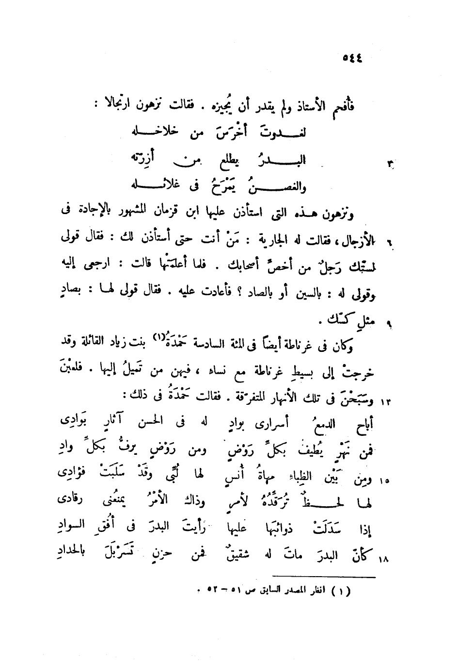 ونزهون هذه التى استأذن عليها ابن قزمان المشهور بالإجادة فى الأرجال، فقالت له الجارية: من أنت حتى أستأذن لك: فقال قولى لستّك رجل من أخصّ أصحابك. فلما أعلمتها قالت: ارجعى إليه وقولى له: بالسين أو بالصاد؟ فأعادت عليه. فقال قولى لها: بصاد مثل كسّك.