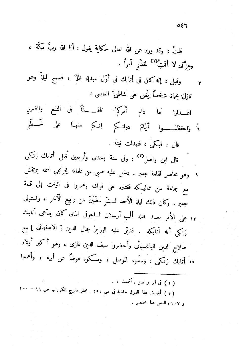 وقيل: إنه كان فى أتابك فى أوّل مبدإه ظلم، فسمع ليلة وهو نازل بحماة شخصا يغنى على شاطئ العاصى: